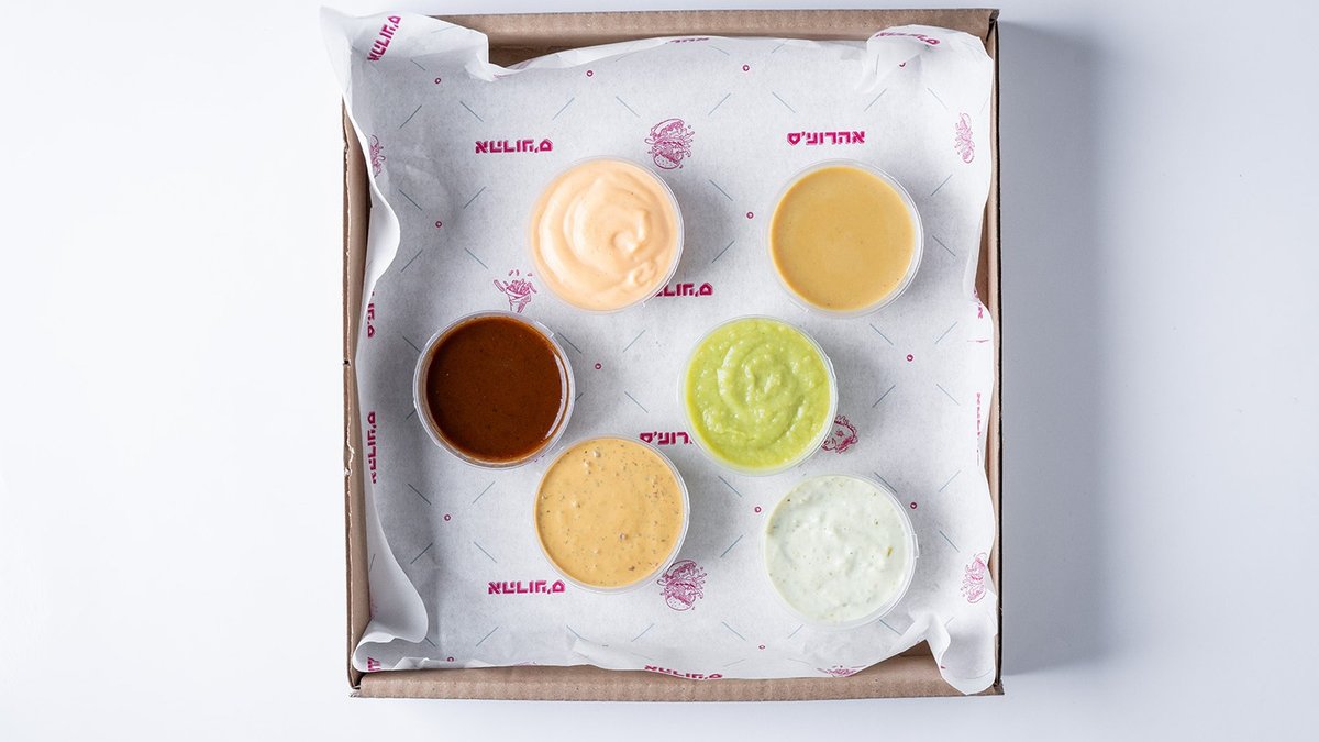 אבוקדו שיפקה, הוט סוס (חריף אש 🌶️🌶️🌶️), רוטב פופקורן, איולי מיסו, ראנצ'ו (חלבי), רוטב הבית ואיולי חלפיניו