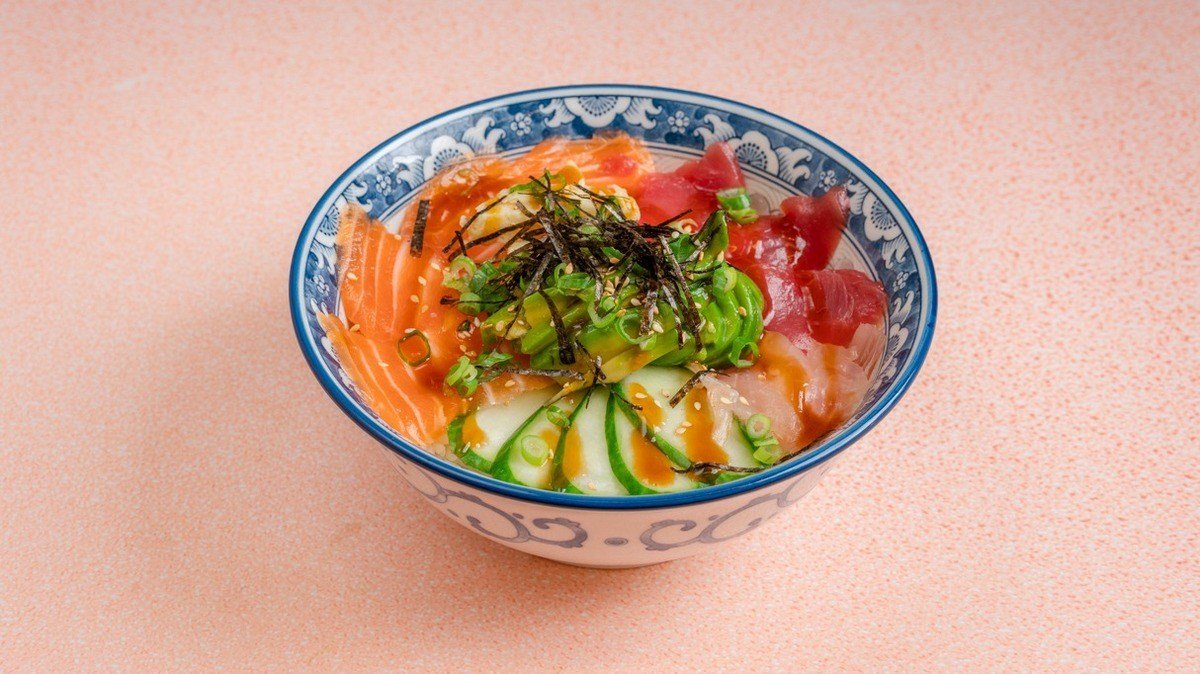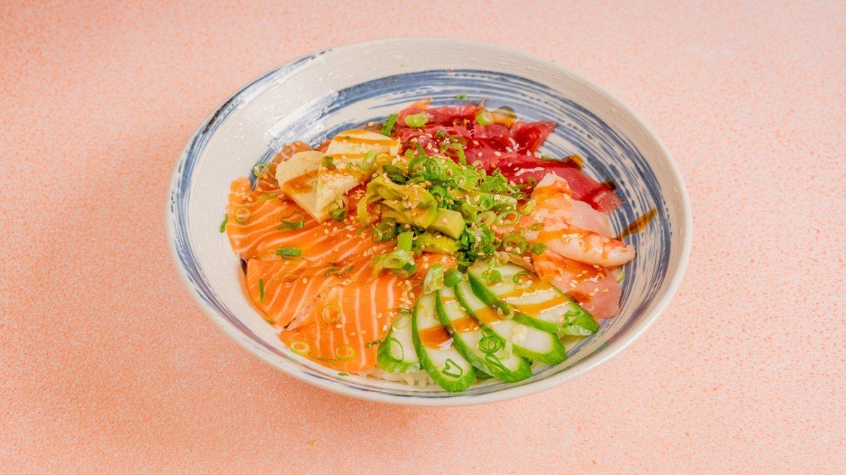 קערת אורז, סלמון, טונה, בס וטמאגו מעוטרת בירקות וברוטב טריאקי ביתי