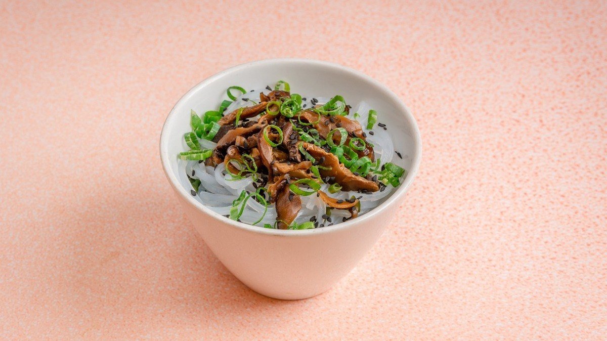 אטריות עמילן שקופות עם מלפפונים, ביצי דגים, פטריות שיטאקי, בצל ירוק ושומשום ברוטב הבית