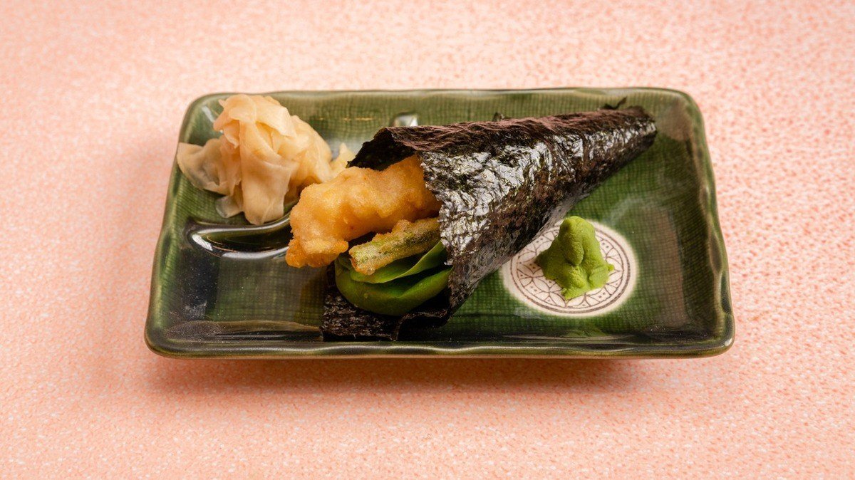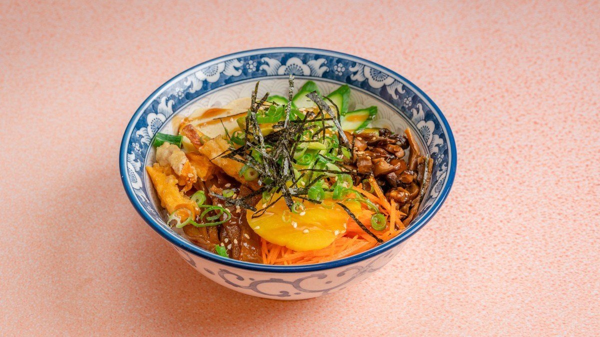 קערת אורז עם דג לבחירה, חציל, גמבה ובטטה בטמפורה, אצות נורי ושומשום מעל