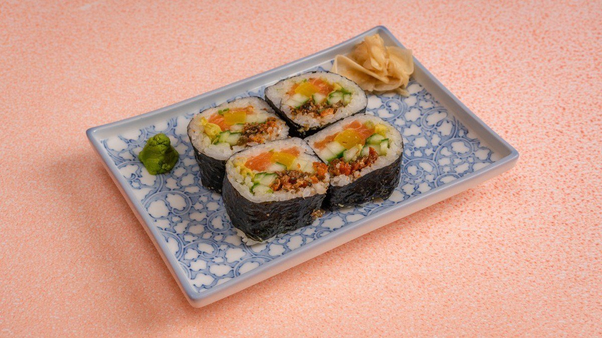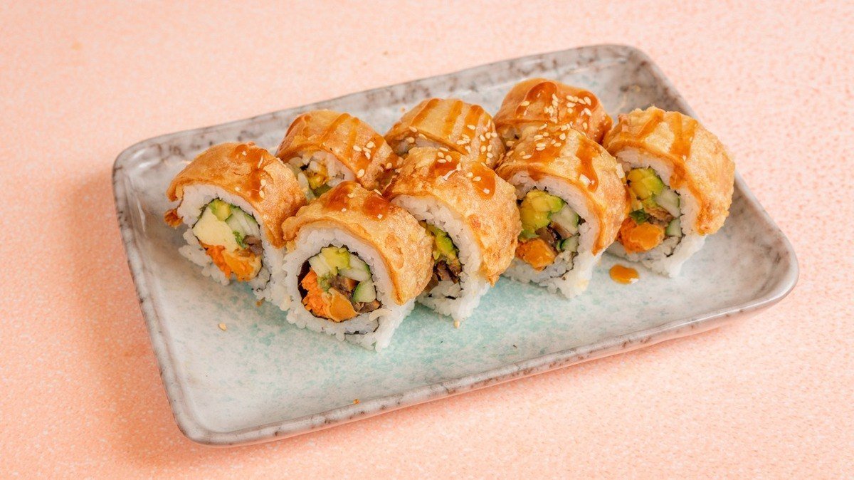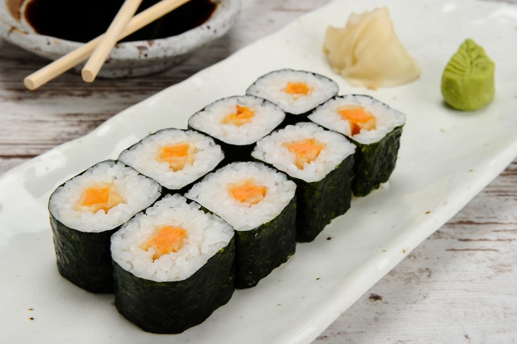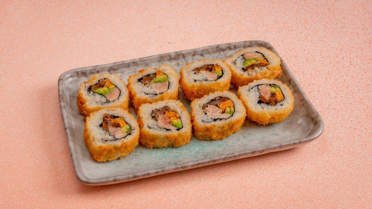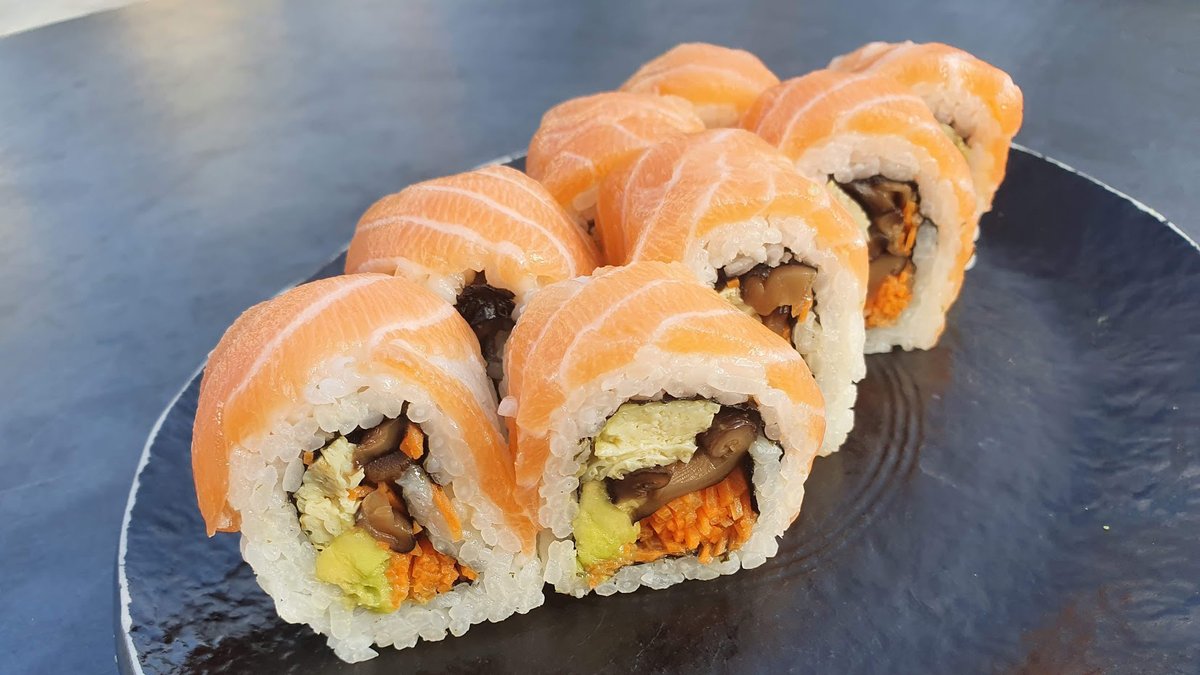רול סושי עם סלמון, מלפפון, חצי מאקי בטטה בטמפורה, ניגירי טמאגו, תוספת עגבניות שרי ואדממה
