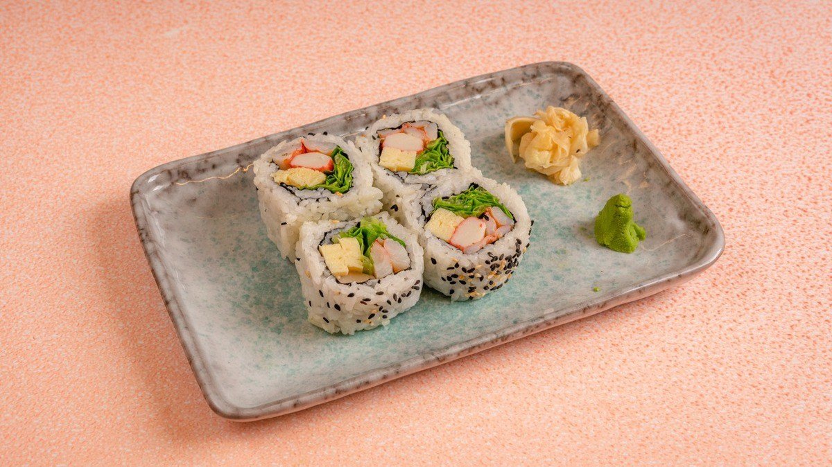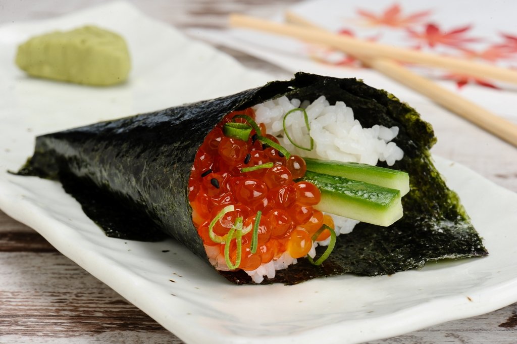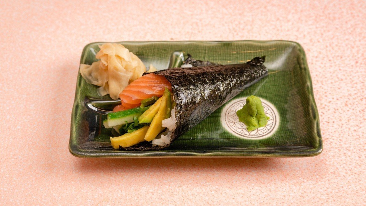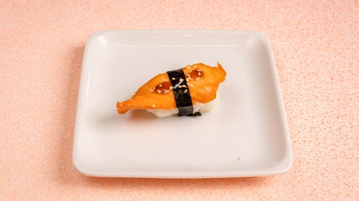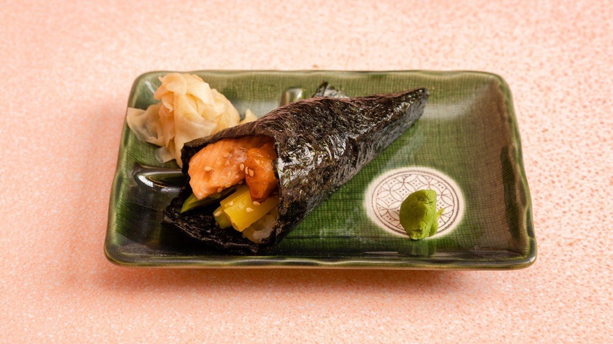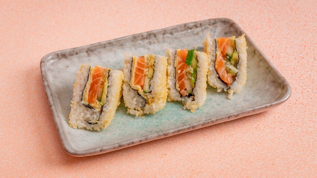רול סושי עם סלמון, מלפפון, חצי מאקי בטטה בטמפורה, ניגירי טמאגו, תוספת עגבניות שרי ואדממה