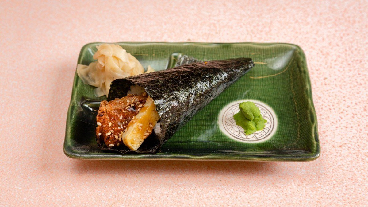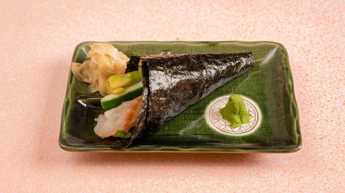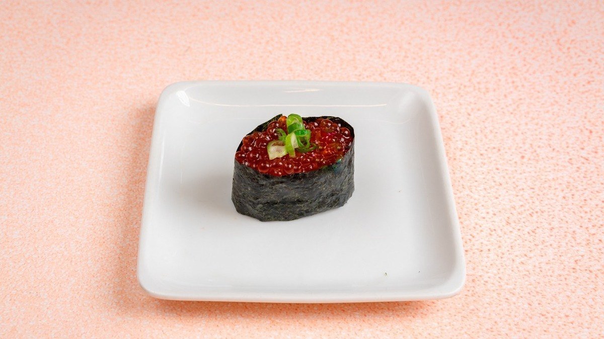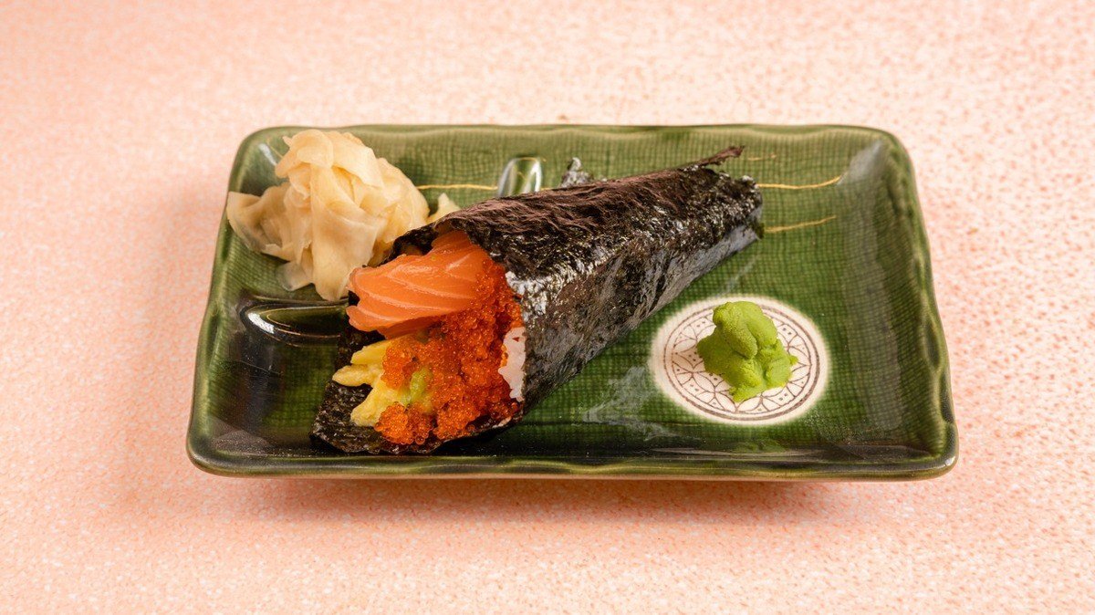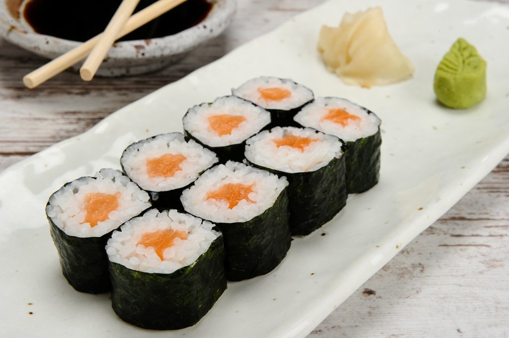 רול סושי עם סלמון, מלפפון, חצי מאקי בטטה בטמפורה, ניגירי טמאגו, תוספת עגבניות שרי ואדממה