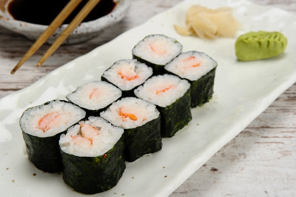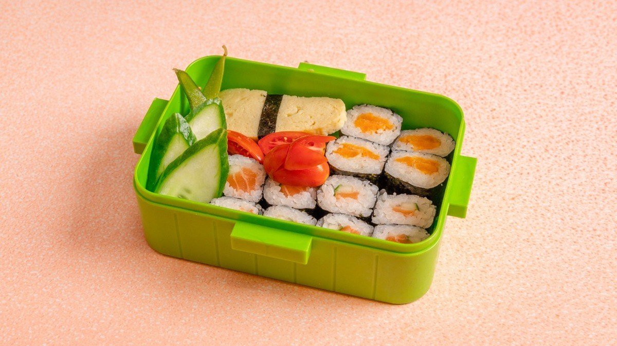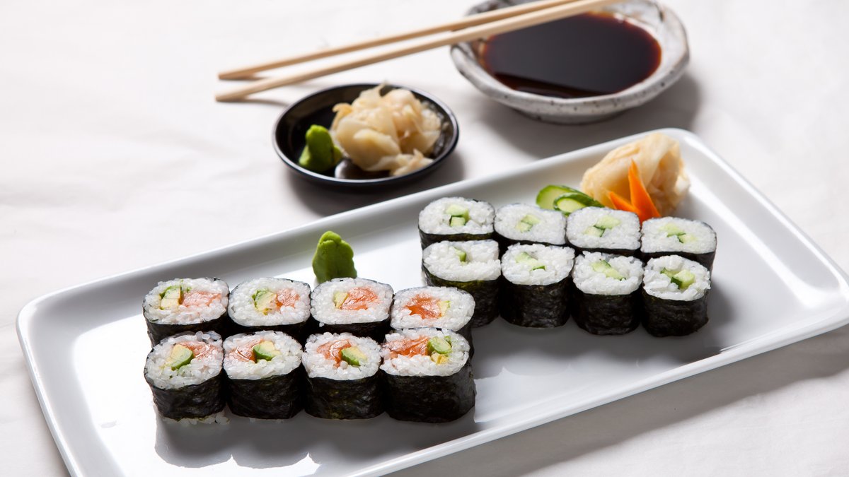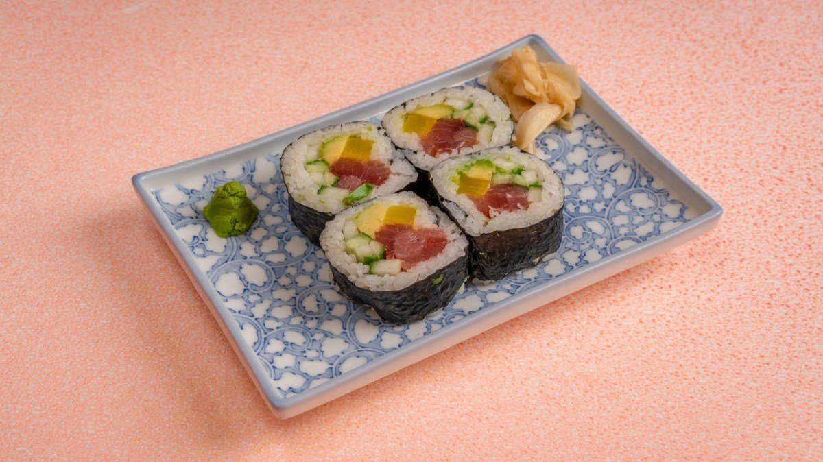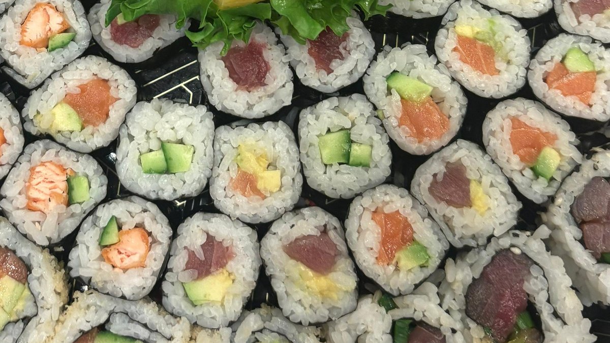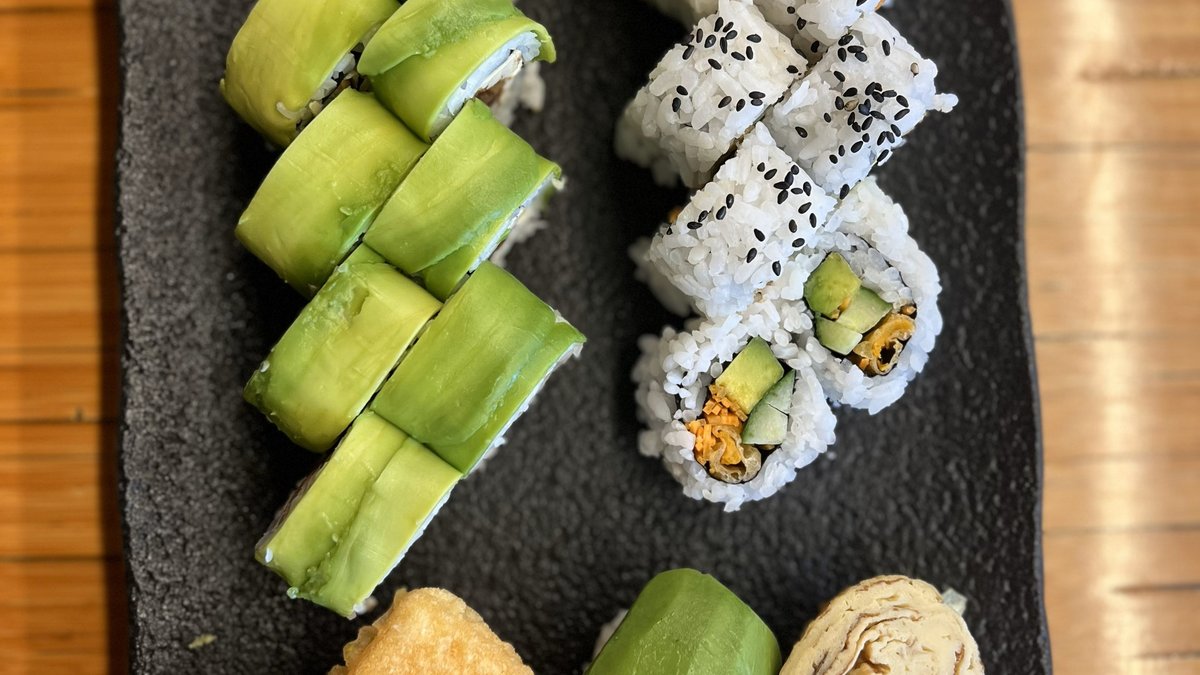 חצי מאקי אבוקדו וחצי מאקי מלפפון בתוספת טמאגו, עגבניות שרי ואדממה