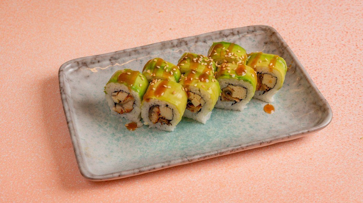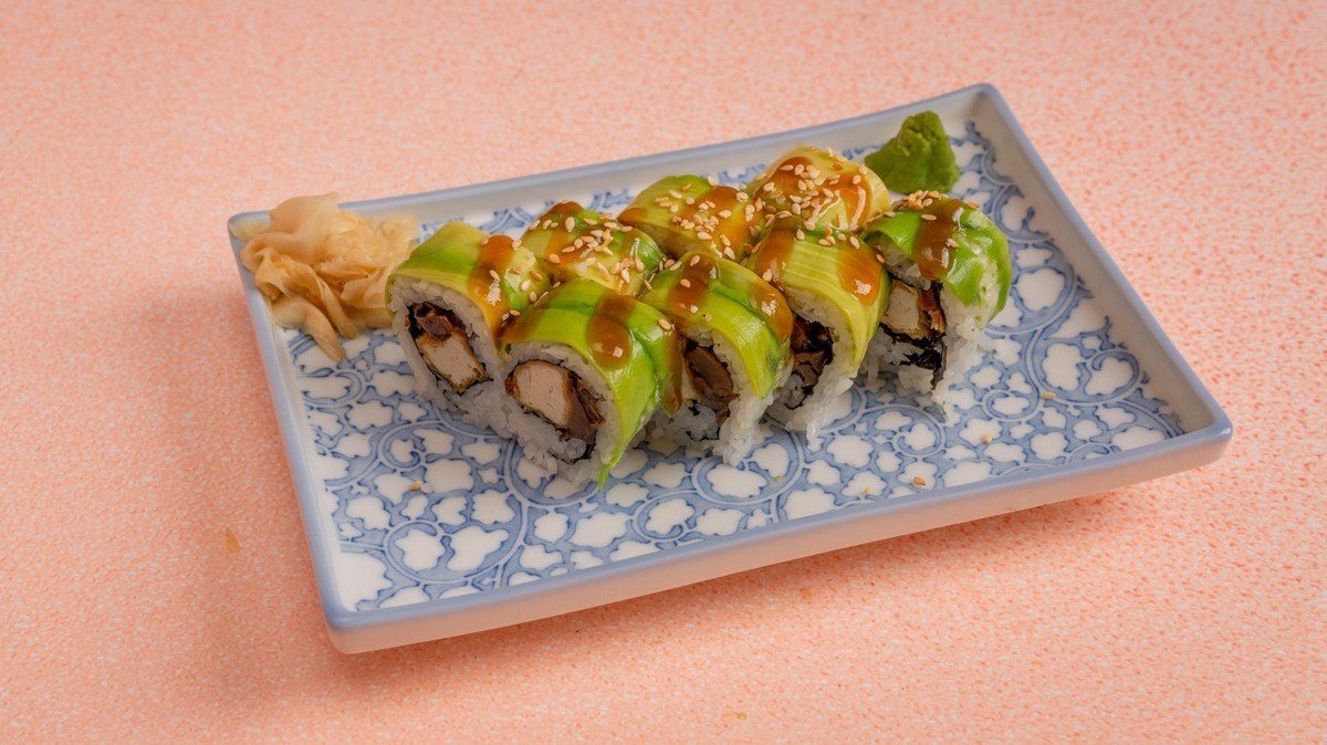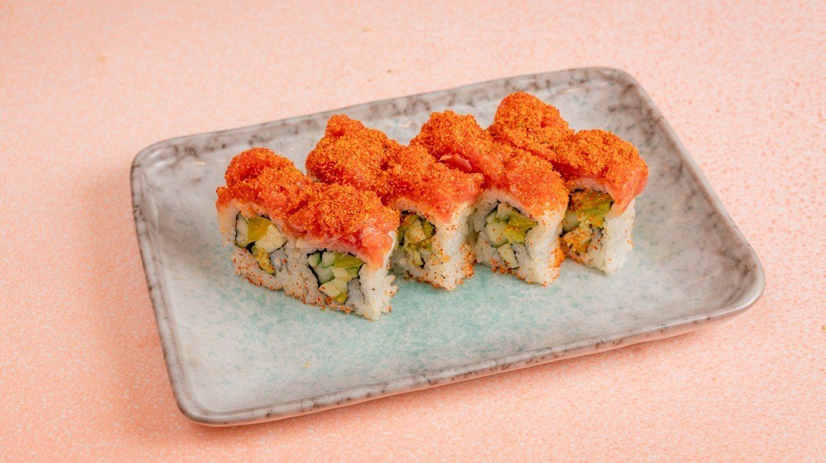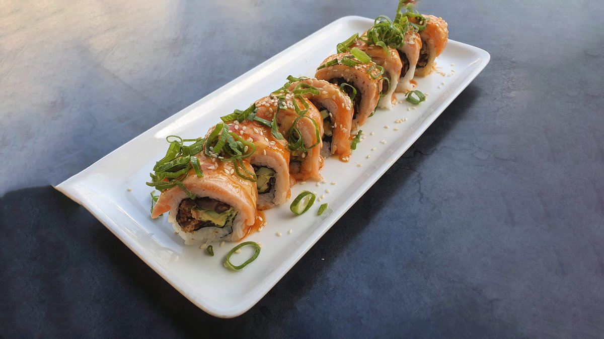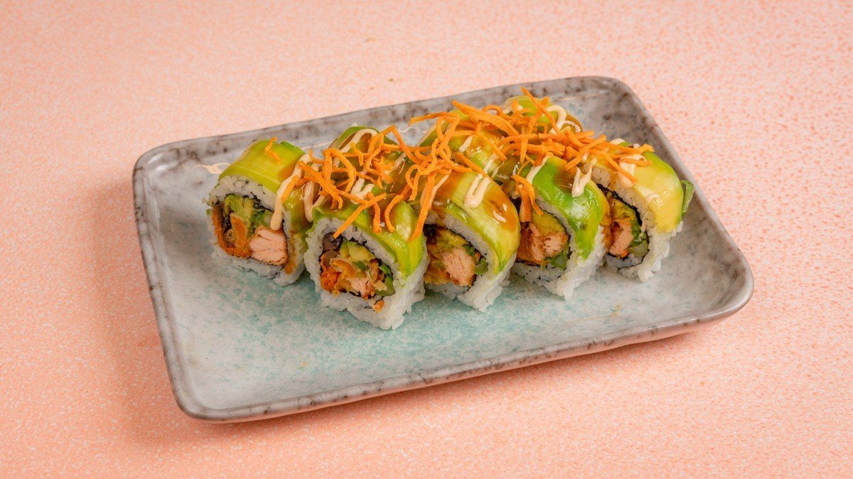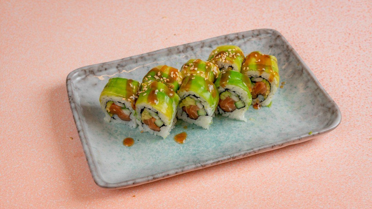רול סושי עם דג סלמון וטונה נא, ג׳ינג׳ר אבוקדו ומלפפון, עטוף באבוקדו עם רוטב ספייסי מיונז, טריאקי ובצל ירוק מעל