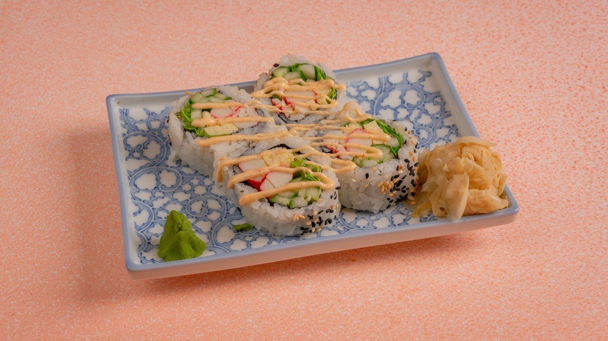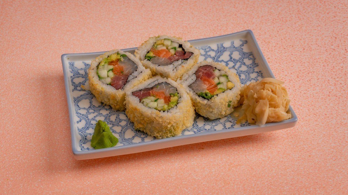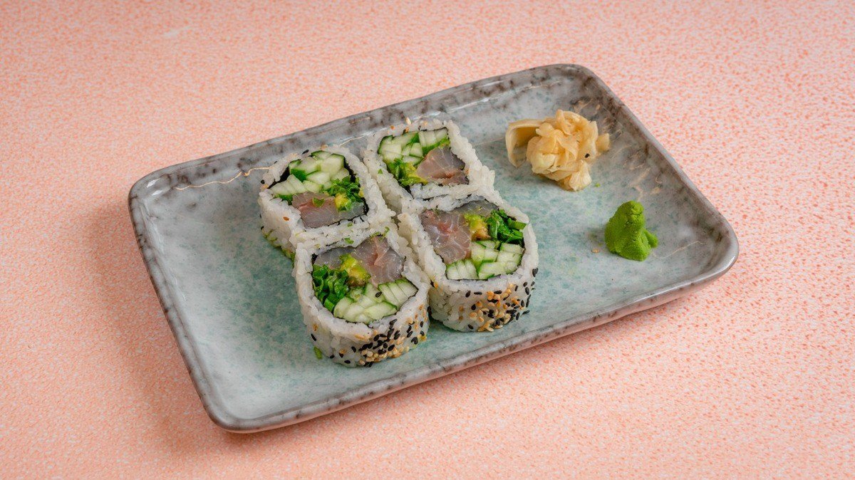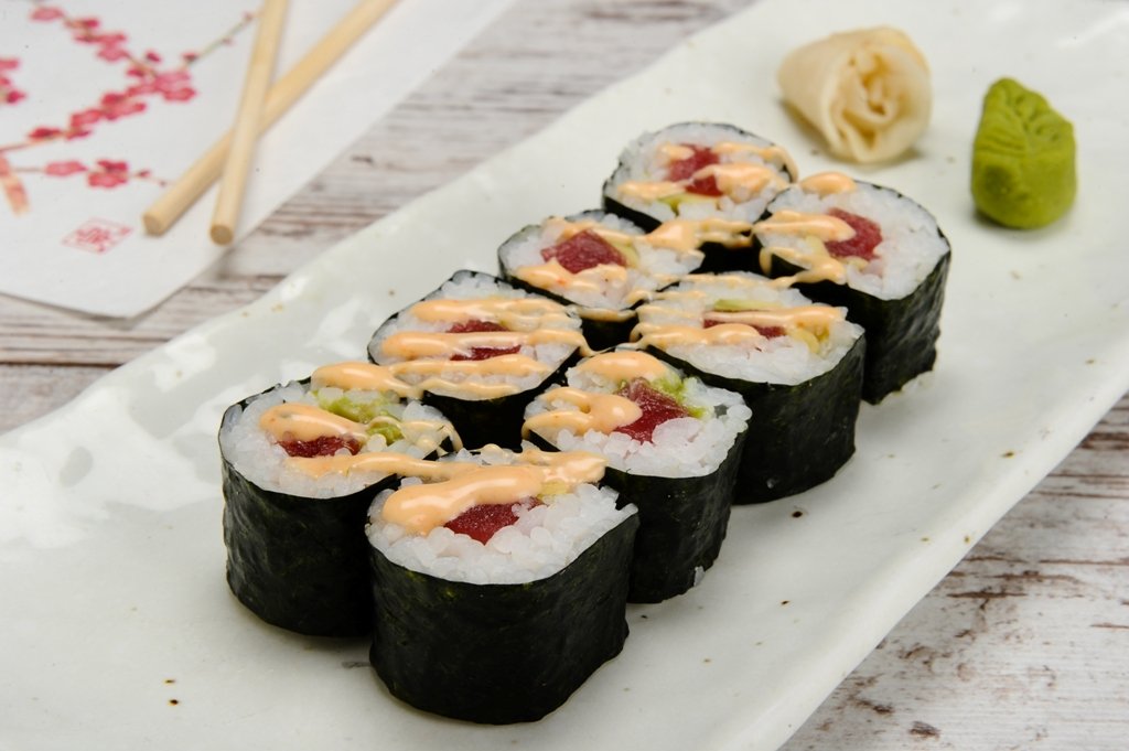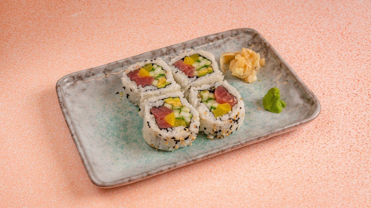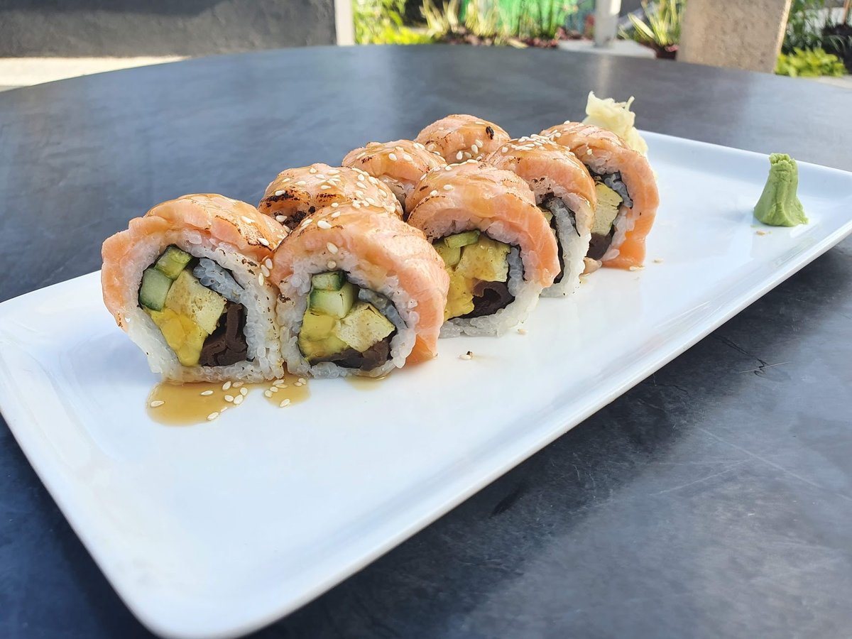 רול סושי עם דג סלמון וטונה נא, ג׳ינג׳ר אבוקדו ומלפפון, עטוף באבוקדו עם רוטב ספייסי מיונז, טריאקי ובצל ירוק מעל