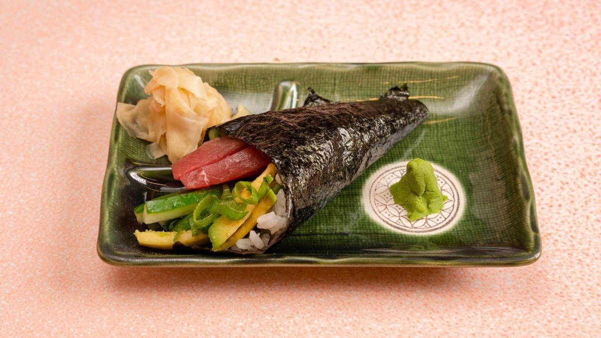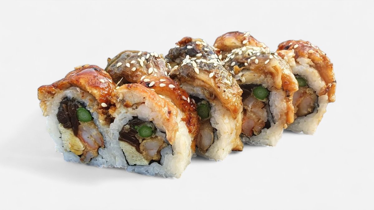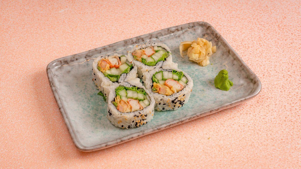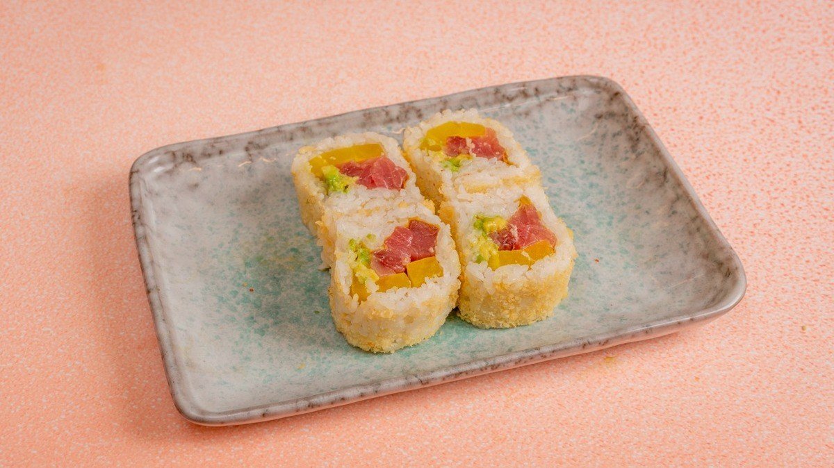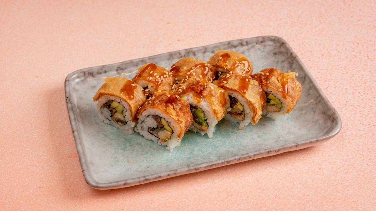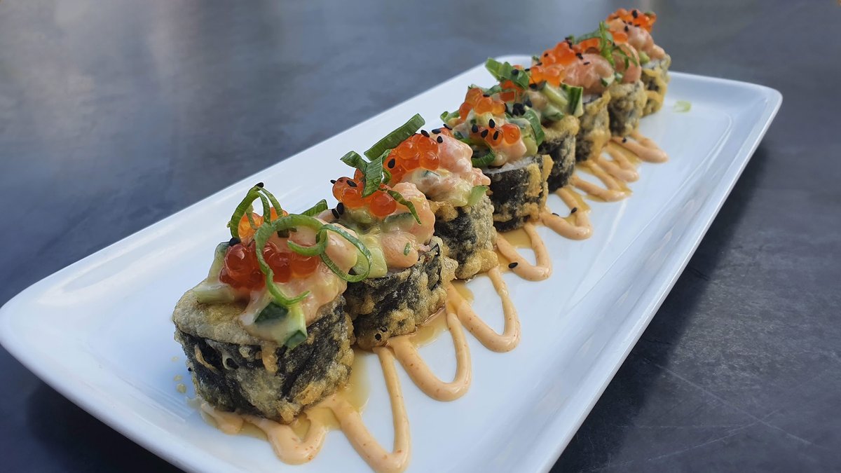 רול סושי עם דג סלמון וטונה נא, ג׳ינג׳ר אבוקדו ומלפפון, עטוף באבוקדו עם רוטב ספייסי מיונז, טריאקי ובצל ירוק מעל