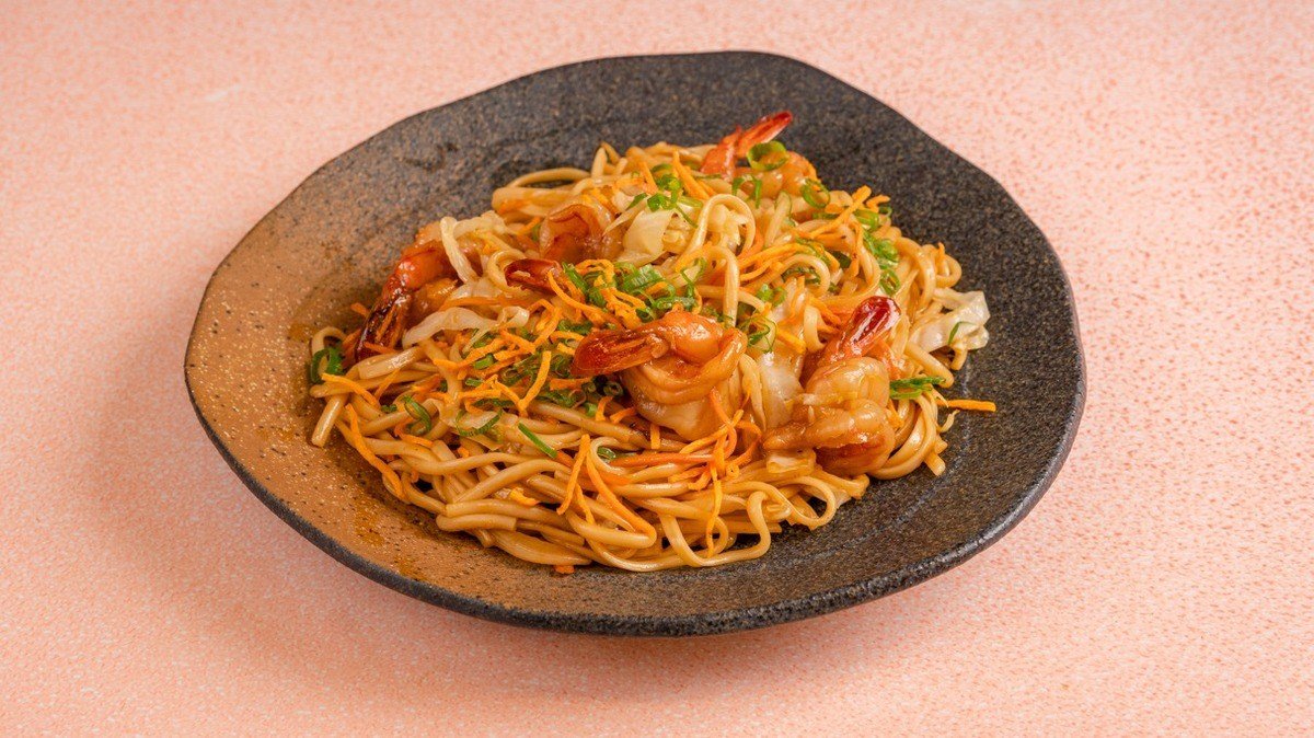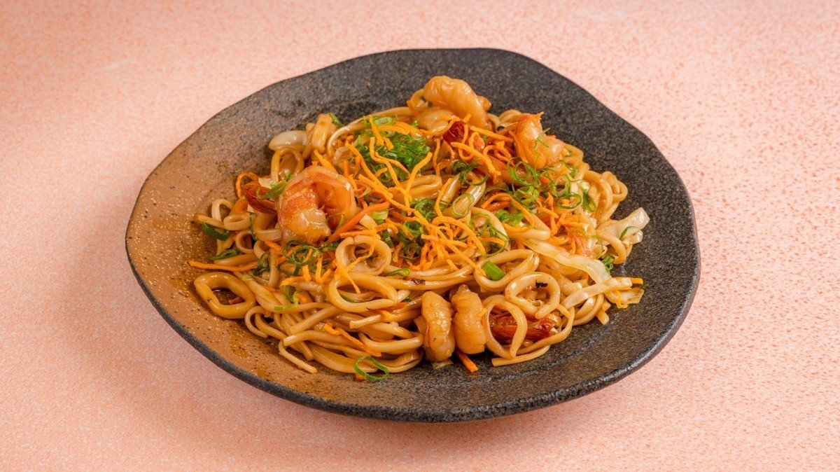 איטריות ביצים, שרימפס, ירקות, ורוטב ברביקיו הבית