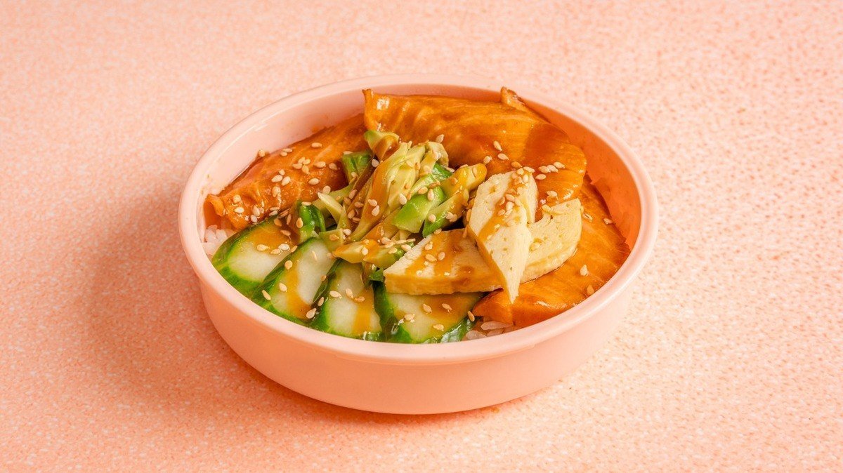 קערת אורז עם מלפפון, אבוקדו, טמאגו ודג סלמון מבושל