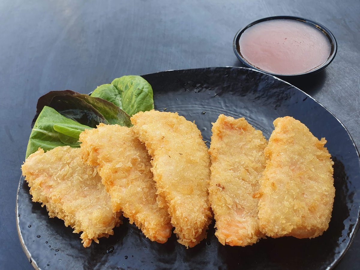 נתחי סלמון מטוגנים בפנקו מוגש עם רטבי הבית