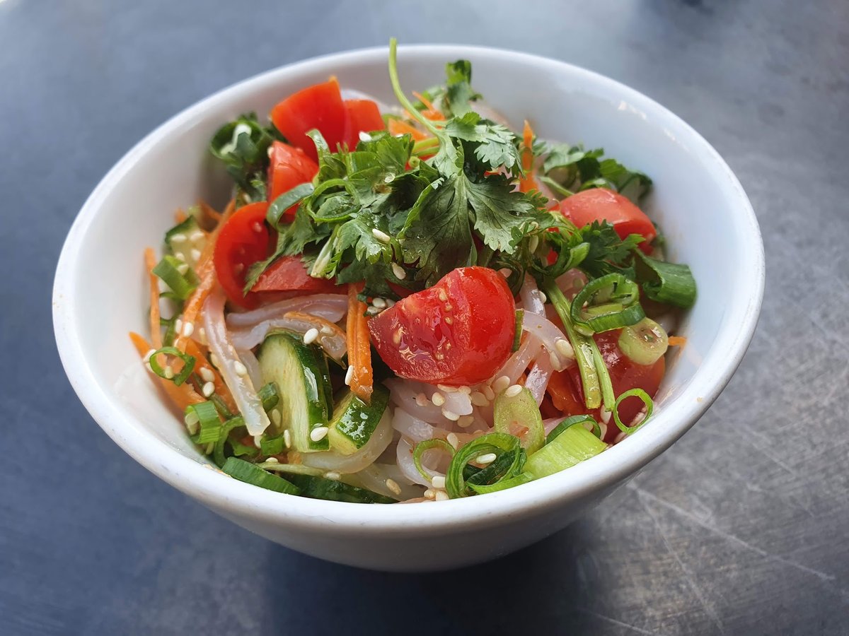 סלט מלפפונים וירקות, עם אטריות עמילן שקופות ברוטב לבחירה