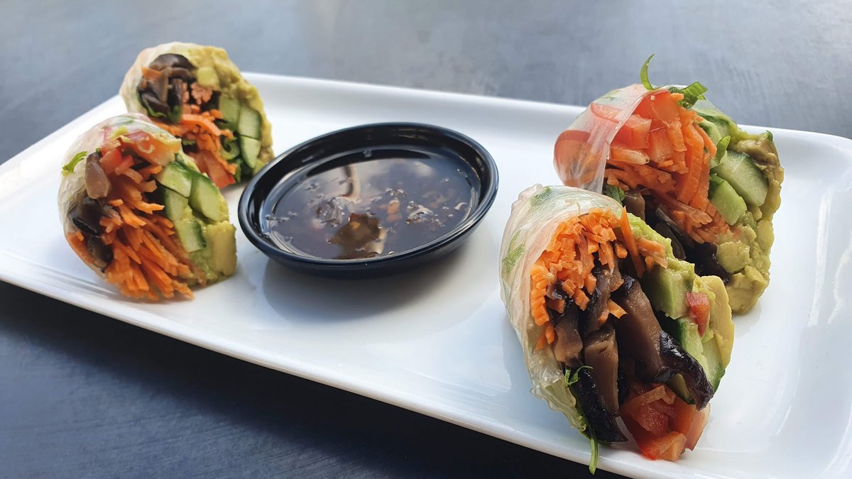 מבחר ירקות ודג לבחירה עטופים בדף אורז עם רוטב צ'ילי מתוק ורוטב סלט יפני ביתי