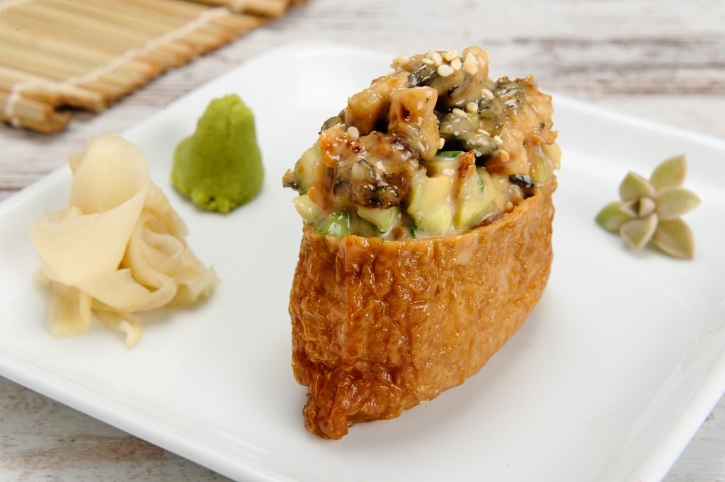 כיסון טופו מטוגן, עטוף באצה, ממולא אורז, דג נא לבחירה, ירקות ורוטב הבית