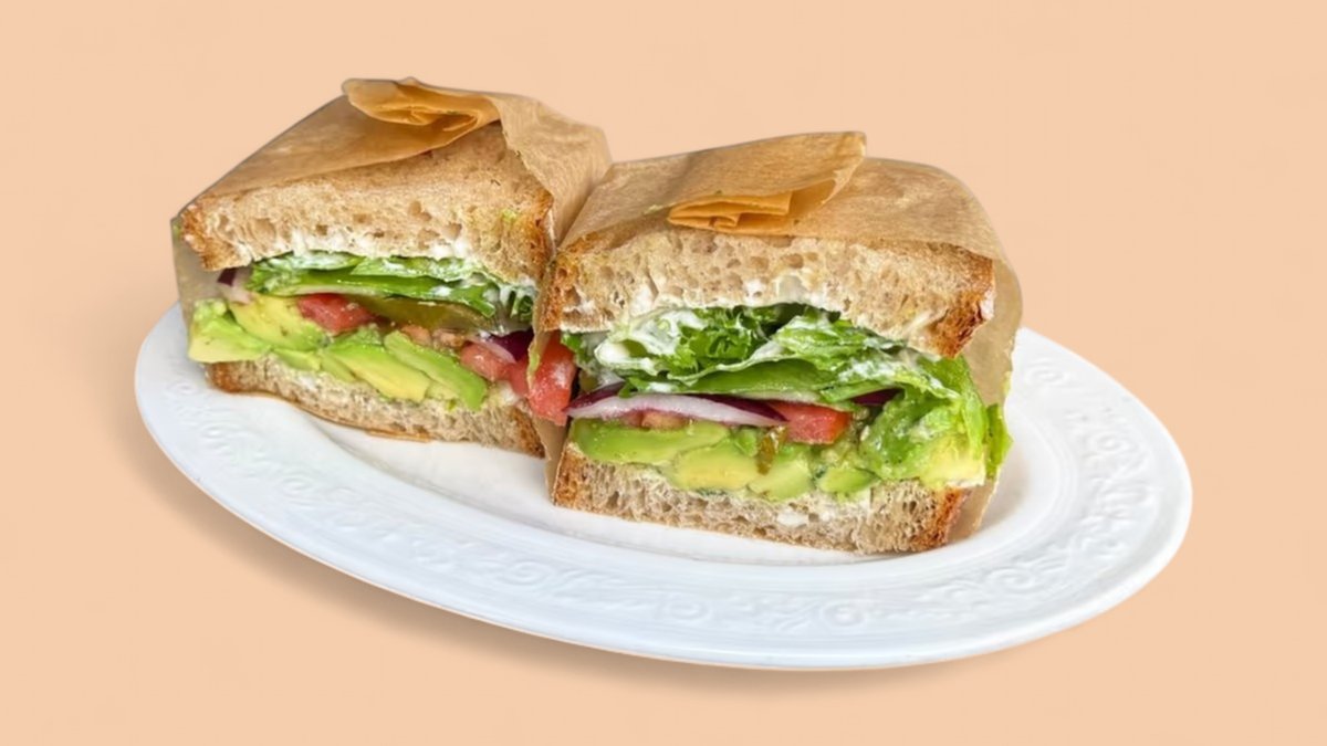 לחם מחמצת שלנו, גבינת קשיו, אבוקדו בתערובת של זעתר טרי, שומשום, פלפל שאטה, פלפל שחור ומלח הודי, עגבניה, מלפפון, בצל סגול, חסה לאליק