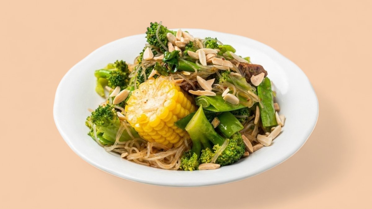 ירוקים חלוטים, רצועות טמפה, אטריות שעועית, שקדים, רוטב סויה, סילאן ושמן שומשום