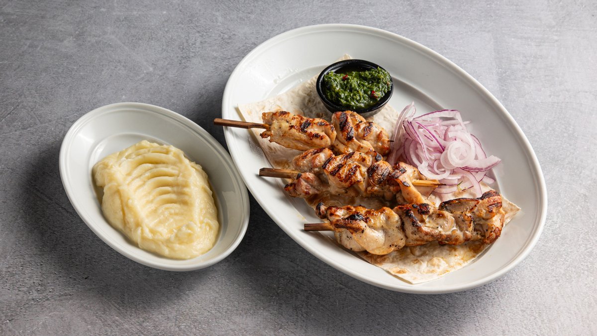 שיפודיני פרגית מוגש רוטב צ'ימיצ'ורי פירה תפו"א חלבי ולאבאש (לחם גרוזיני)
