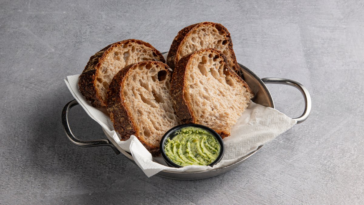 לחם כפרי הנאפה במקום בליווי חמאת עשבי תיבול ביתית