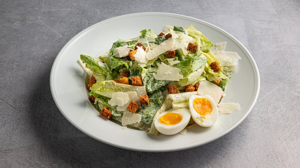 עלי חסה, ביצה חצי קשה וגבינת פרמז'ן מוגש עם רוטב קיסר על בסיס אנשובי