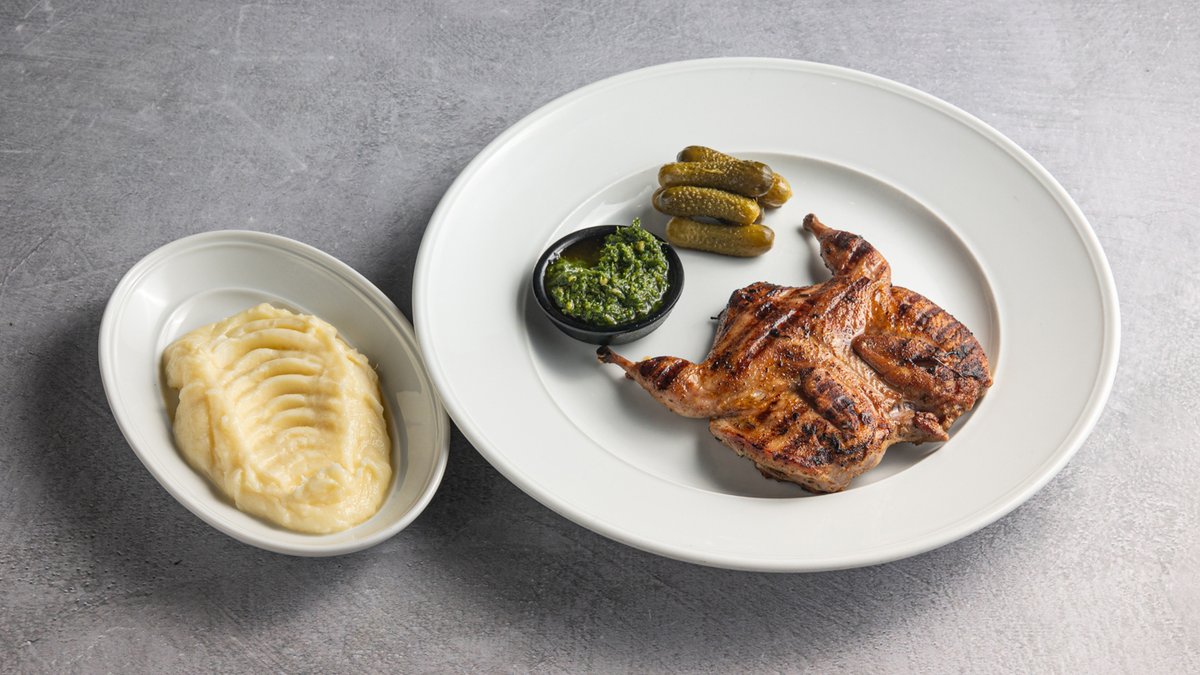 עוף צעיר שנצלה בלחץ, מוגש עם רוטב צ'ימיצ'ורי מלפפונים חמוצים ותפו"א אפוי
