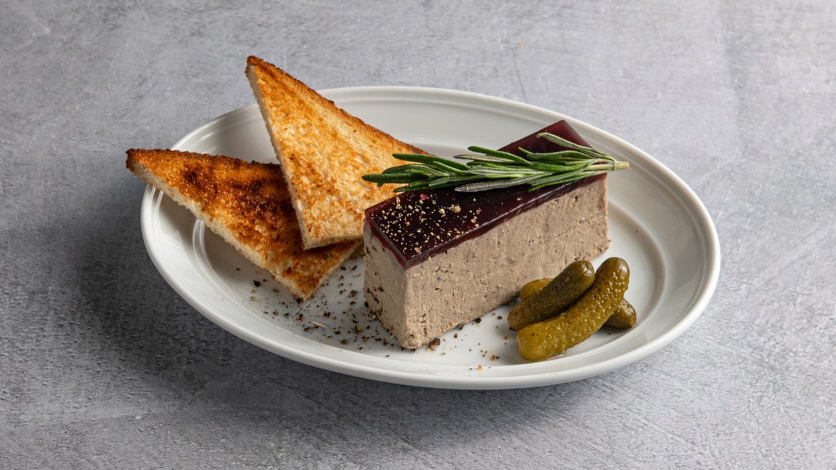 פטה כבד עוף חלק, עם ג'לי דובדבנים, קורנישונים, פלפל שחור טרי, מלח אטלנטי וטוסטונים