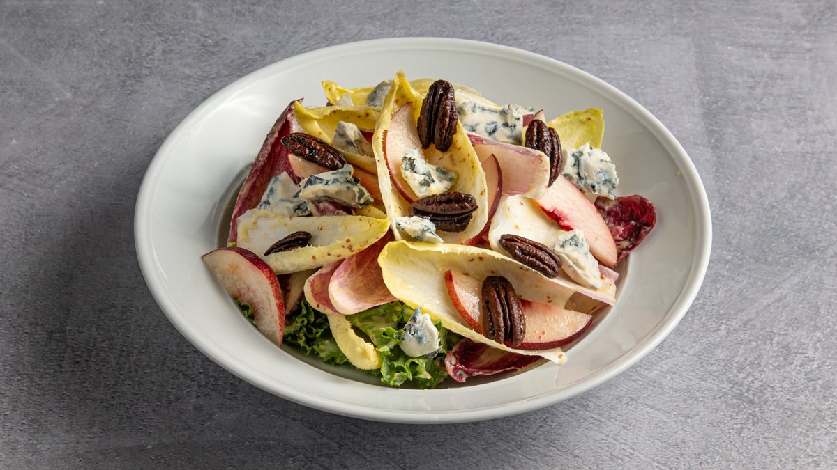 עלי אנדיב טריים צבעוניים, חסה אייסברג, פרי העונה, גבינת Saint Agur צרפתית ברוטב וינגרט הדרים