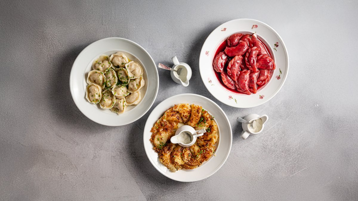 ארוחה מנחמת ומפנקת המורכבת מ 7 מנות: לחם כפרי, סלט אוליבייה, מרק בורשט, מרק דגים, ורניקי תפו"א, פילמני בשר ומחבת בקר