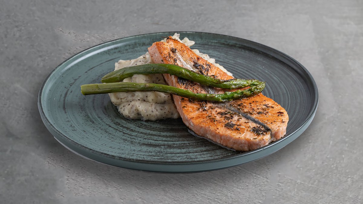 פילה סלמון צרוב על הפלאנצ׳ה עם פירה כמהין ואספרגוס