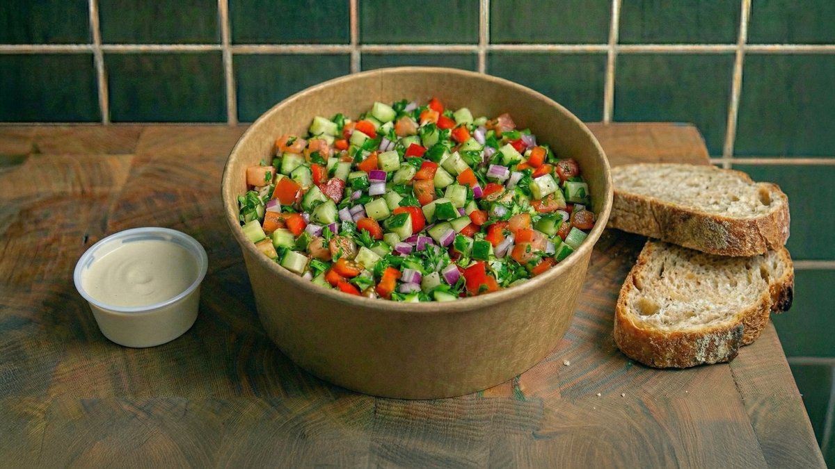 סלט קצוץ , מלפפון , עגבניות מגי , גמבה צהובה , בצל אדום , פטרוזיליה . מוגש עם קוקוט טחינה ולחם הבית .