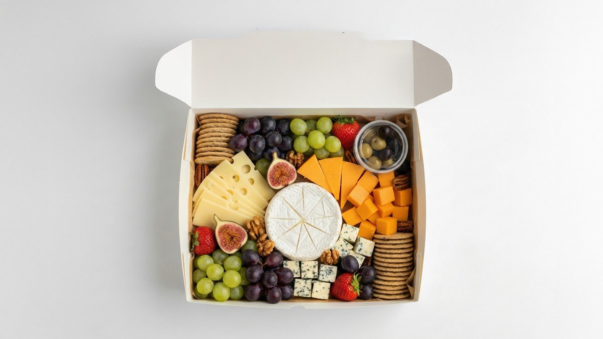 מארז אירוח גבינות כולל - 4 סוגי גבינות , פירות העונה , אגוזים , זיתים , וקרקרים . (משתנה בהתאם למלאי שמותאם בחנות)