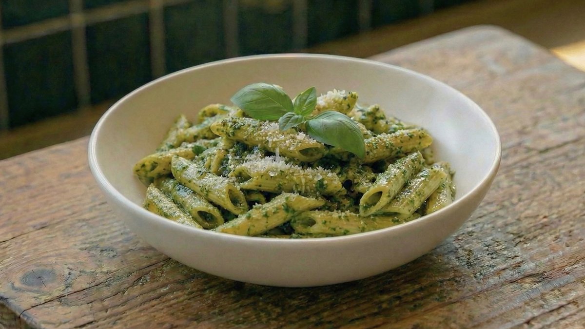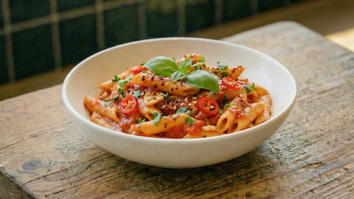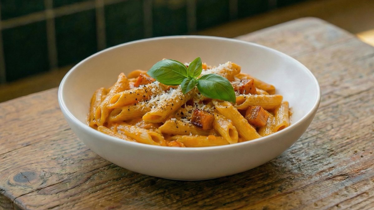 פסטה ברוטב שמנת עשירה ומחית עגבניות עדינה, עם בצל קצוץ, שום קונפי, בזיליקום טרי ופרמזן איטלקי .