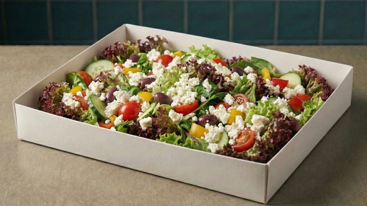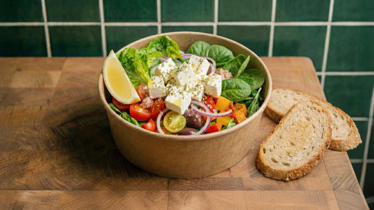 סלט יווני אותנטי. לקט עלי בוטיק וירקות שוק טריים, מועשרים בזיתי קלמטה וגבינת פטה איכותית .