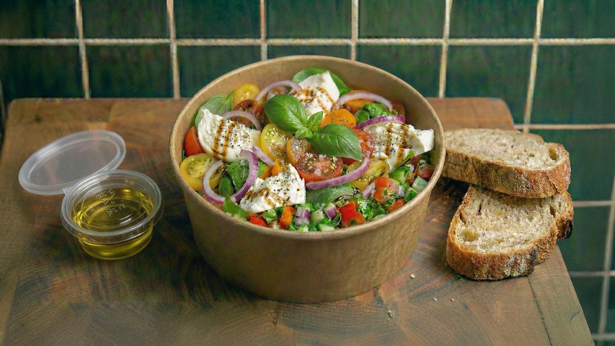 סלט מוצרלה , מיקס עלי בייבי , שרי בצבעים , בצל אדום , קרעי מוצרלה . מוגש עם שמן זית בלסמי , פלפל שחור , ולחם הבית .