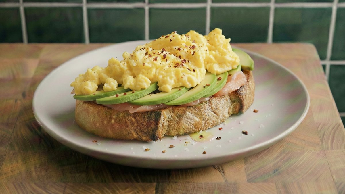 לחם כוסמין קלוי עם פרוסות דקות של אבוקדו בתוספת סלמון מעושן פלפל שחור סקוויז ליים וצ׳ילי ומקושקשת .