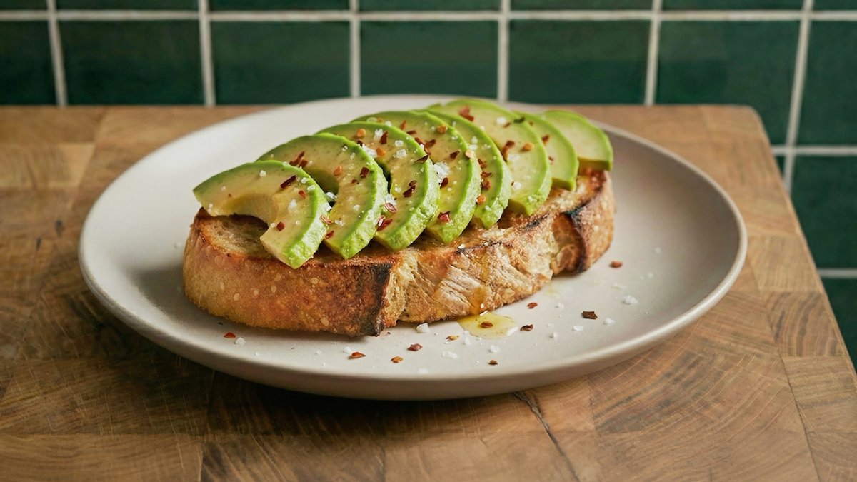 לחם כוסמין קלוי , עם פרוסות דקות של אבוקדו , סקוויז של ליים , פלפל שחור וצ׳ילי