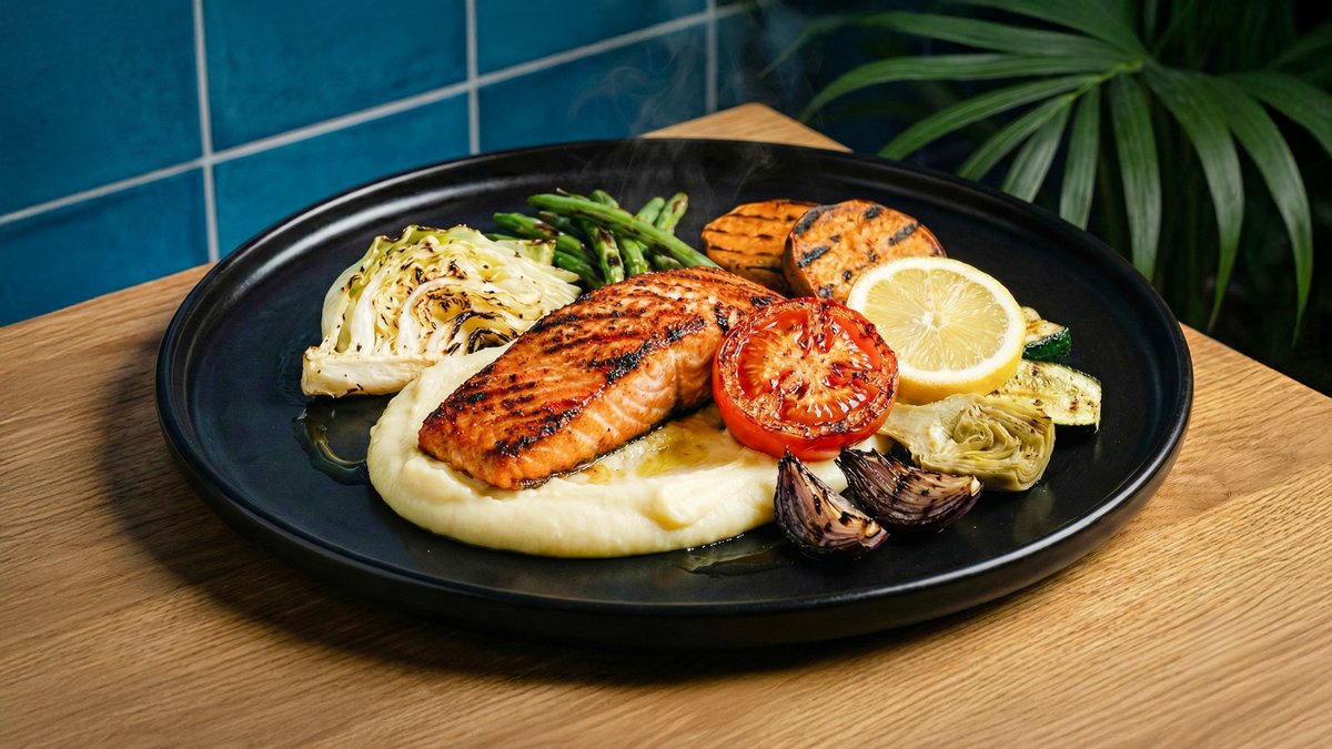 פילה סלמון איכותי צרוב , מוגש עם פירה חמאתי וירקות צלויים .