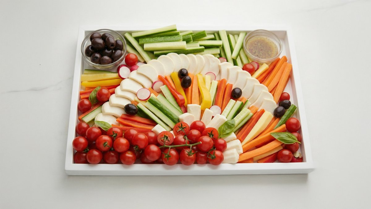 מארז אירוח ירקות כולל - מלפפון , שרי , זיתי קלמטה , קולורבי , גזר , גמבות בצבעים , לבבות דקל , תירס גמדי (משתנה בהתאם למלאי המותאם בחנות)