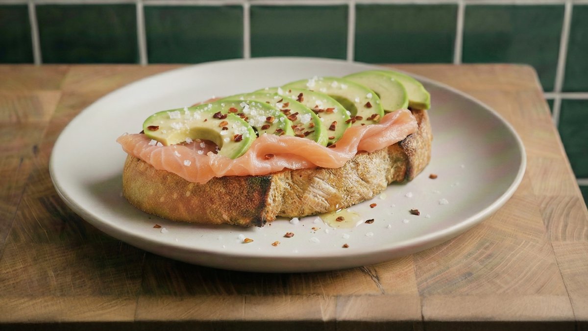 לחם כוסמין קלוי, עם פרוסות דקות של אבוקדו , בתוספת סלמון מעושן , פלפל שחור , סקוויז ליים , וצ׳ילי