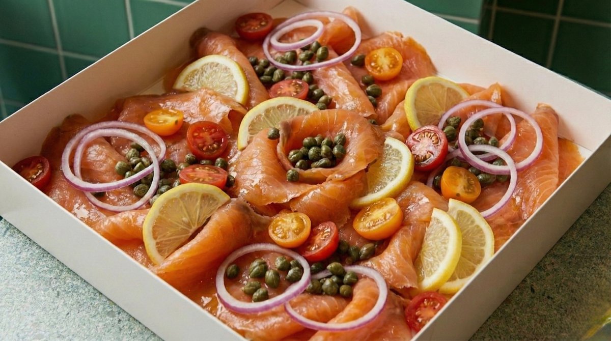 סלמון מעושן מובחר (700 גרם). מוגש עם שרי, צלפים, בצל סגול ולימון. איכות ללא פשרות.