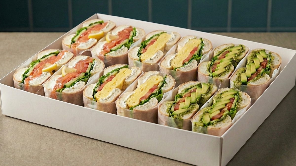 מארז אירוח כריכים כולל - 12 כריכונים , מיקס 3 אבוקדו , 3 סלט ביצים , 3 טונה , 3 סלמון מעושן