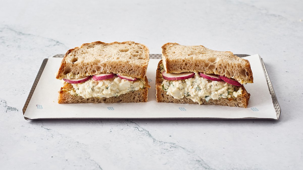 סלט ביצים ביתי (ביצים, זרעי חרדל, בצל ירוק, מיונז, שמיר, חרדל ועירית) וצנונית