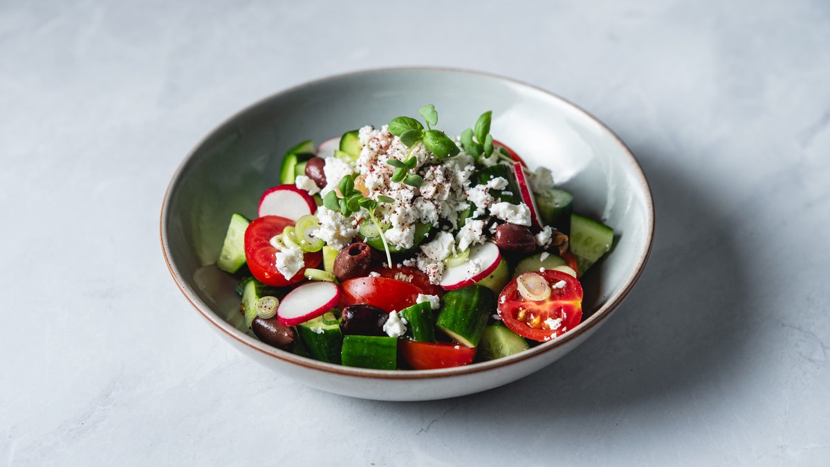 מלפפון, שרי, צנונית, זיתי קלמטה, בצל ירוק ועלי מיקרו עם גבינה בולגרית בסומק, ברוטב שמן זית ולימון