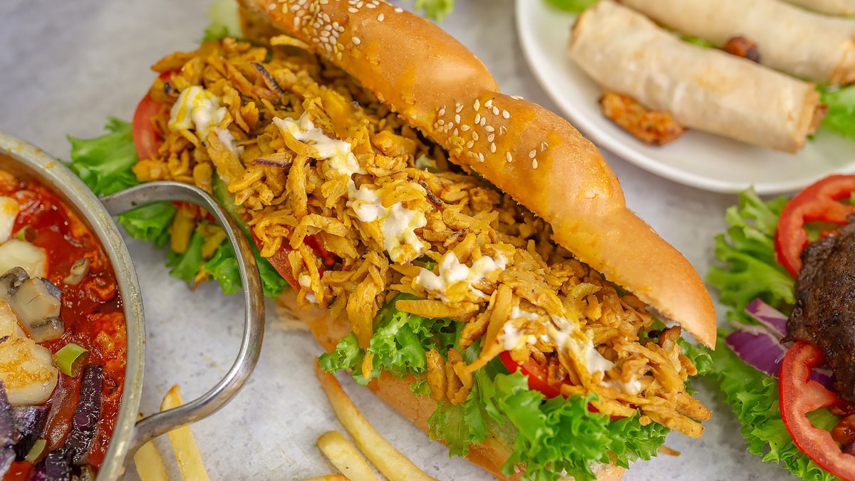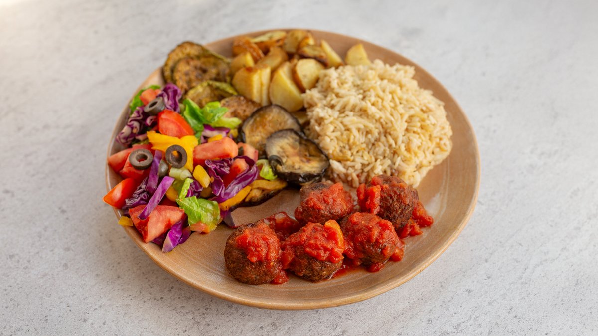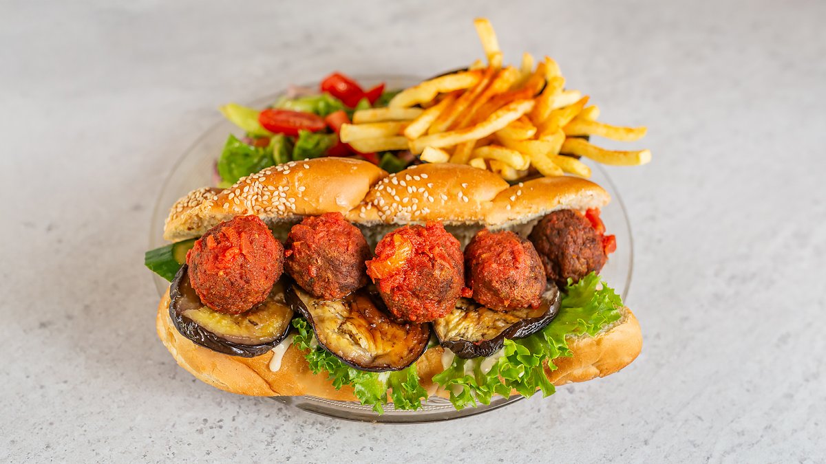 קציצות בקר או עוף, טחינה, מטבוחה .חציל אפוי, מלפפון חמוץ, פלפל ירוק חריף ובצל סגול בלחם לבחירה מוגש עם סלט ותוספת חמה