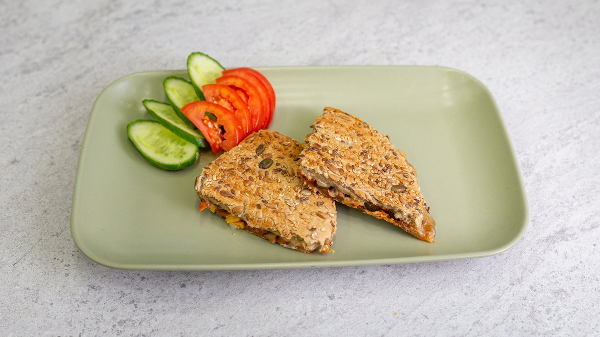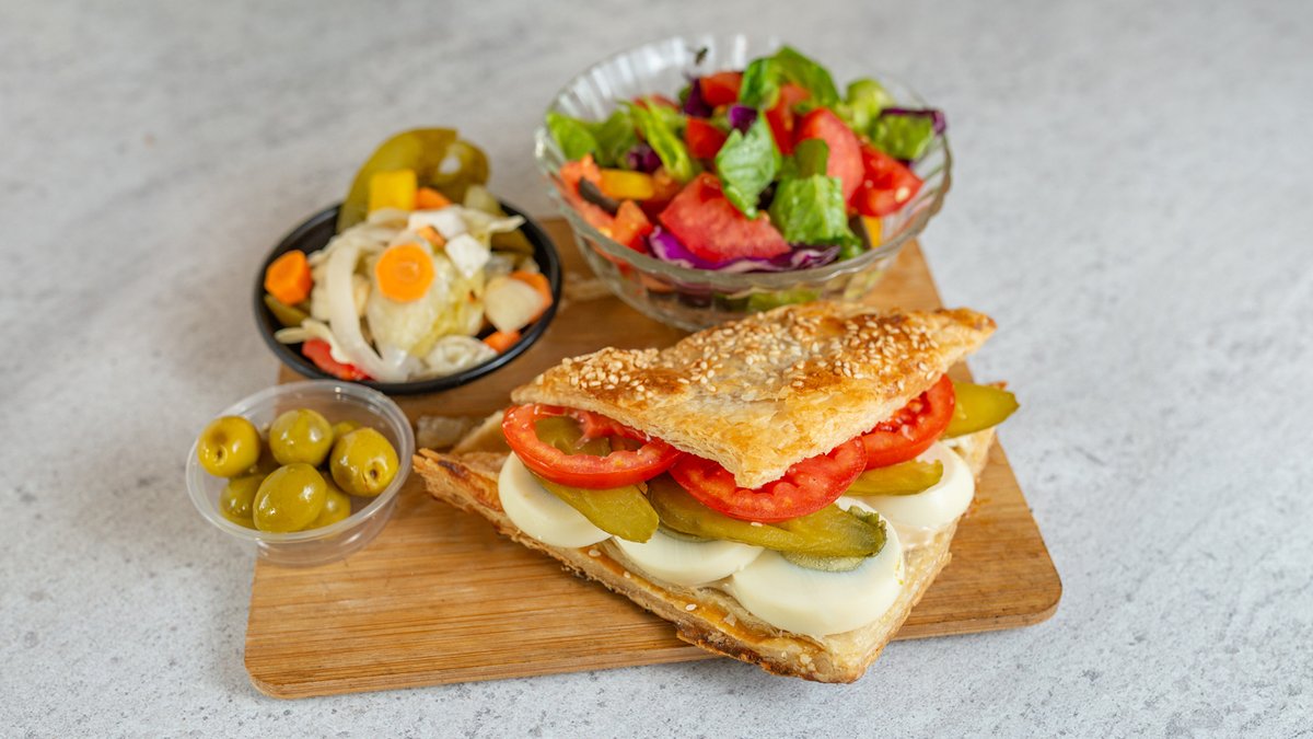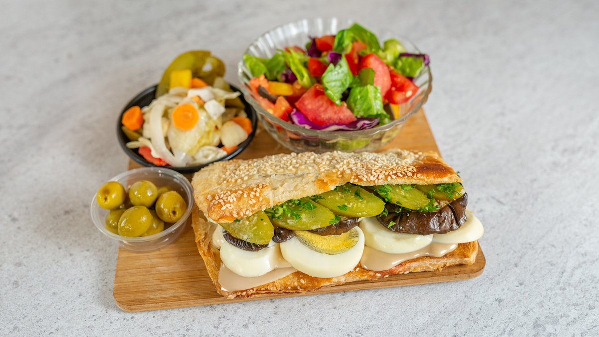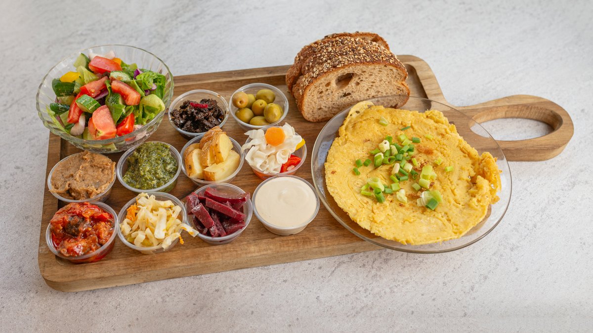 חביתת חומוס, פסטו, טחינה, עגבנייה, מלפפון חמוץ, צנונית וחסה לאליק בלחם לבחירה | טבעוני מוגש עם סלט ותוספת חמה