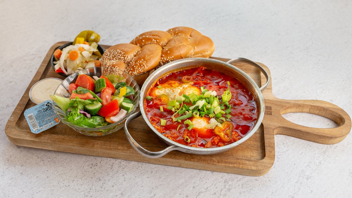 רוטב עגבניות עשיר עם 2 ביצים מוגש עם טחינה, חמוצי הבית, סלט ירקות וחלה
