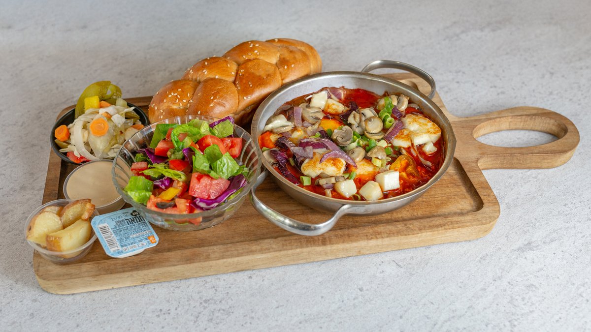 רוטב עגבניות, ביצים, בצל סגול, קוביות חלומי ופטריות צרובות מוגש עם טחינה, חמוצי הבית וחלה