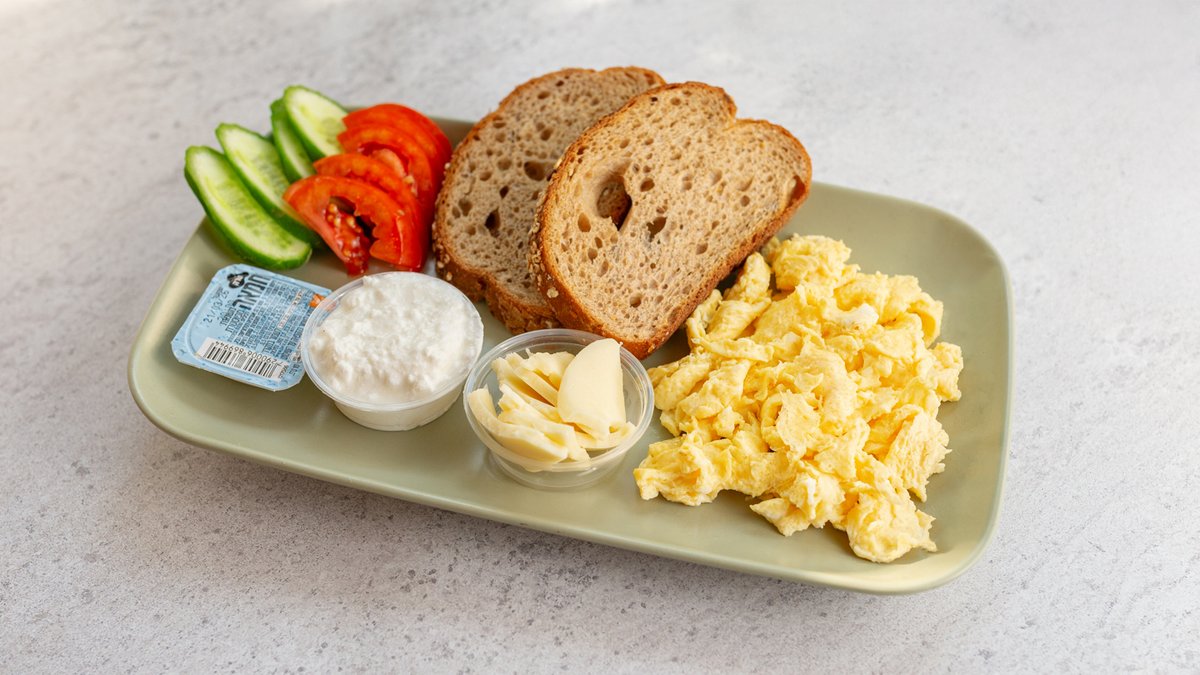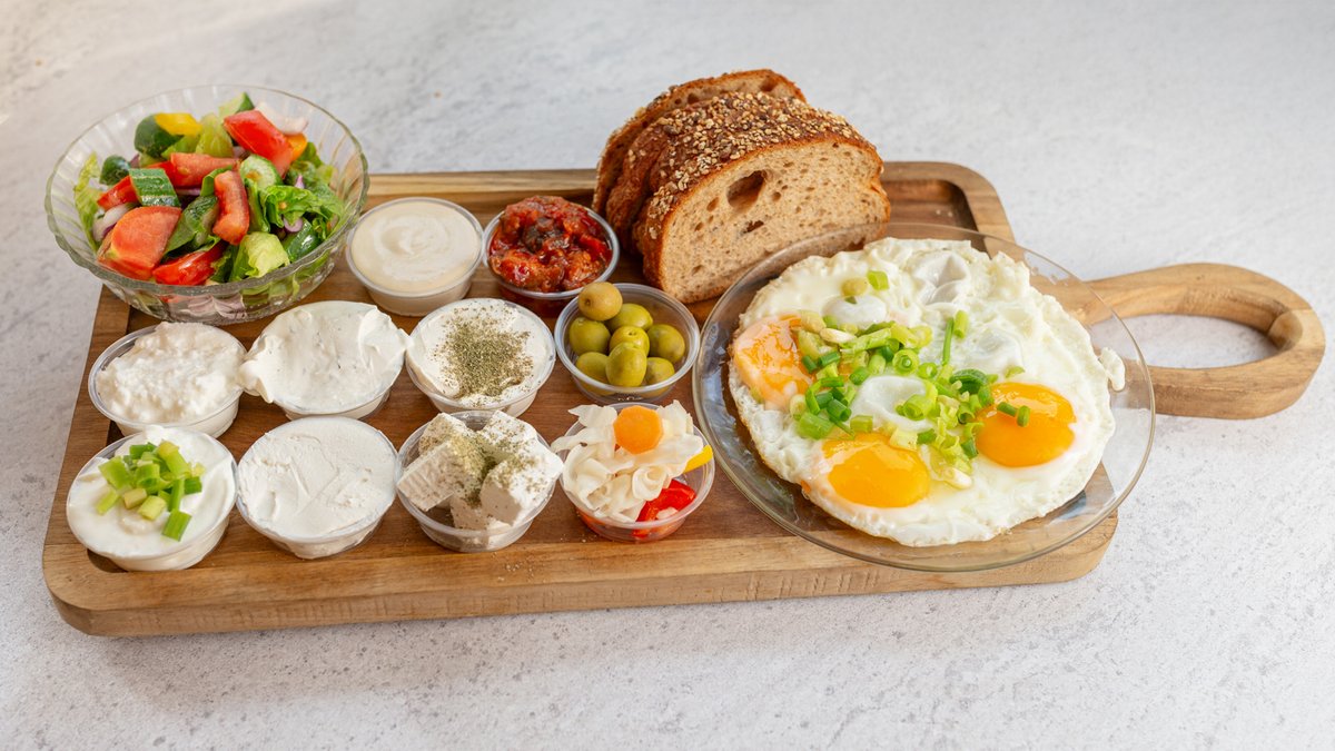 2 ביצים לבחירה ו-3 מטבלים: גבינה 5%, טחינה וזיתים מוגש עם לחם וחמאה, סלט ירקות טרי ומיץ סחוט