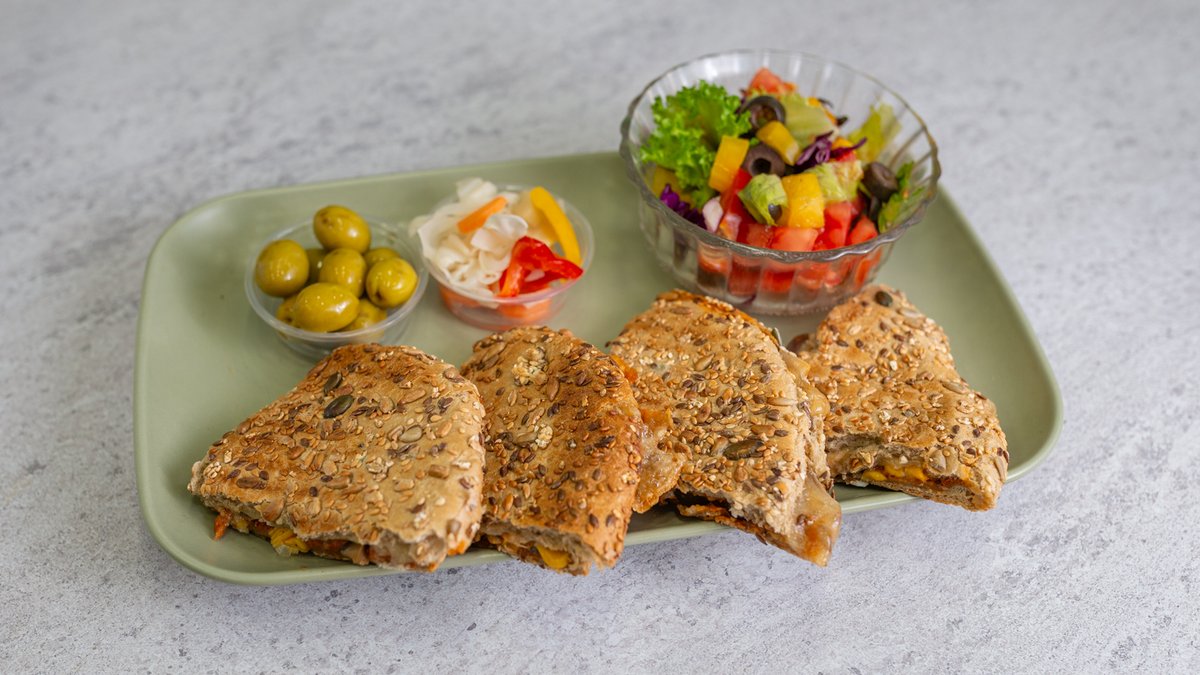 פרעצל או חלה עם גאודה וזיתים מוגש עם ירקות חתוכים