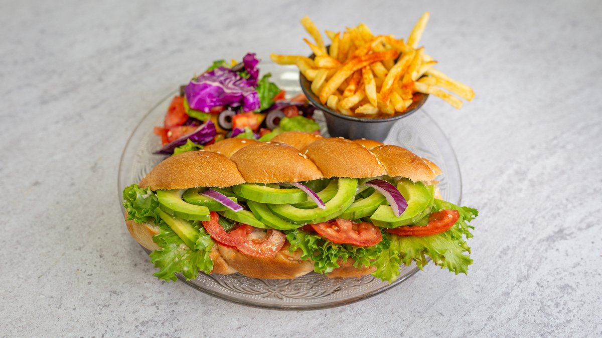 אבוקדו טרי, חסה לאליק, בצל ירוק, בזיליקום טרי, עגבניה ובצל סגול בלחם לבחירה | טבעוני מוגש עם סלט ותוספת חמה