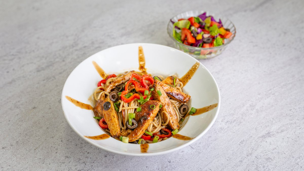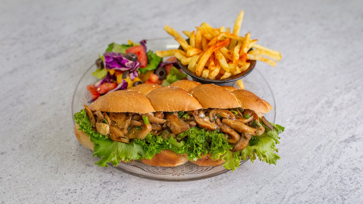 פטריות מוקפצות ברוטב אסייתי, חסה לאליק, בצל ירוק, צנונית ואריסה בלחם לבחירה | טבעוני מוגש עם סלט ותוספת חמה