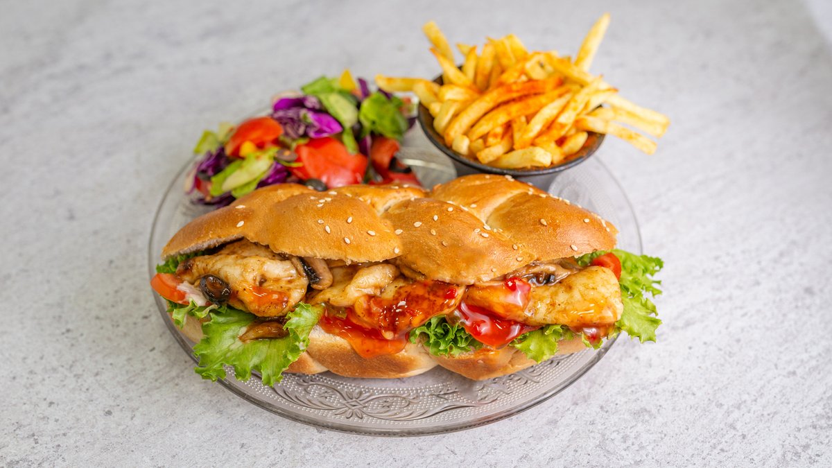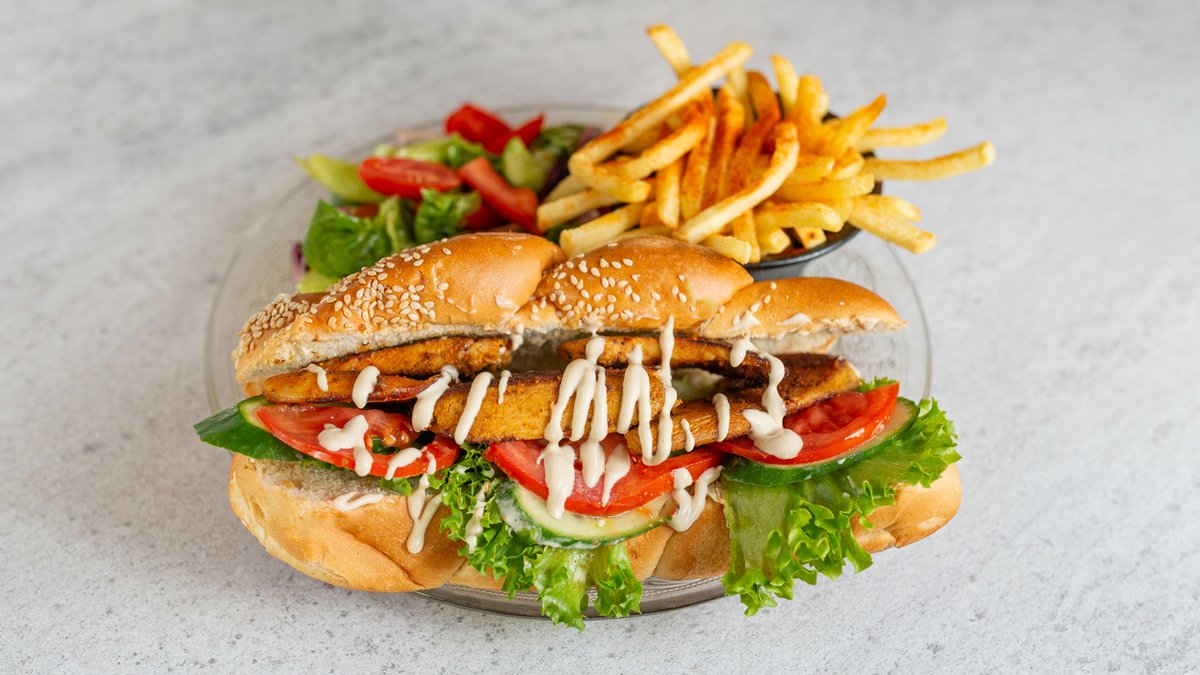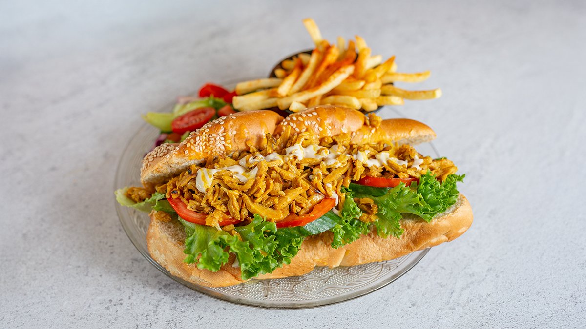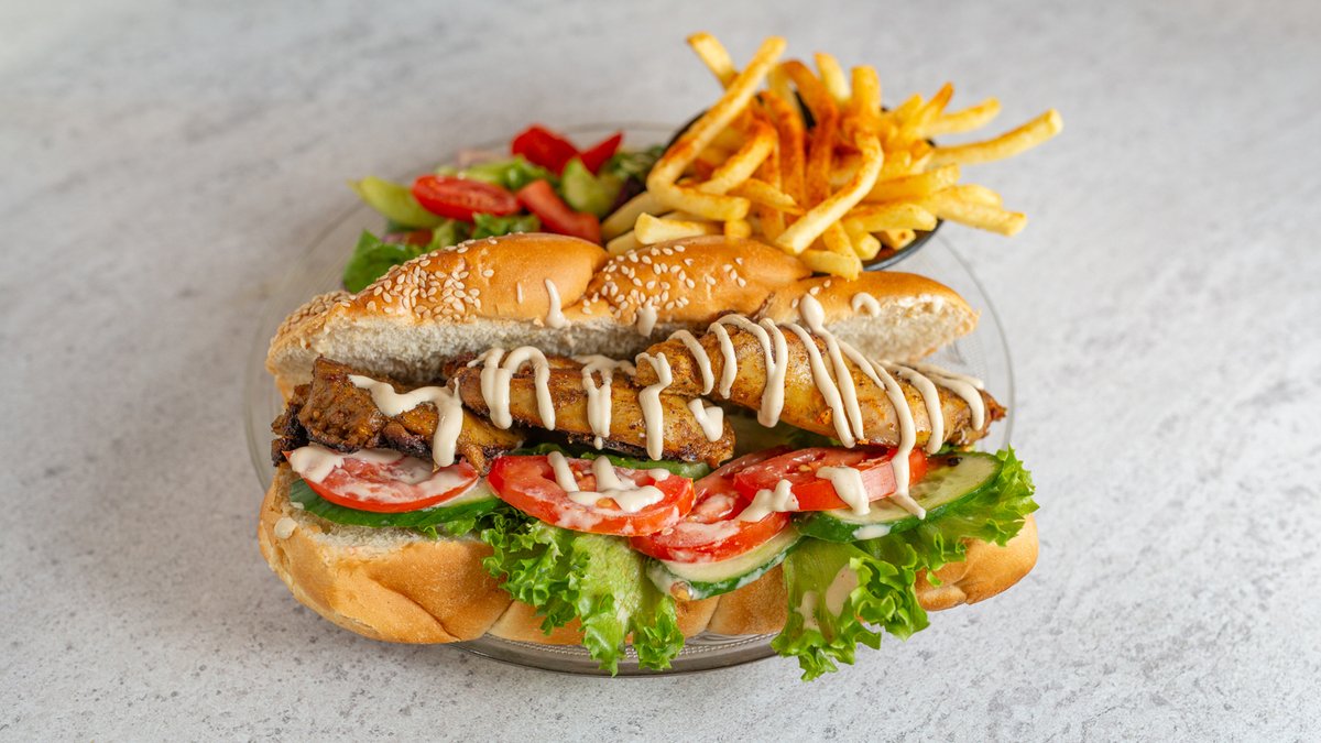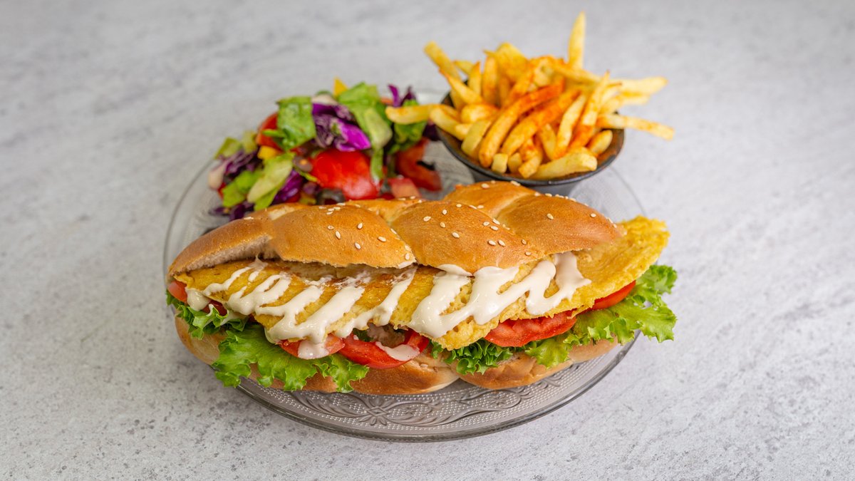 חזה עוף, טחינה ,חסה לאליק, עגבניה , בצל מטוגן ומלפפון חמוץ בלחם לבחירה מוגש עם סלט ותוספת חמה